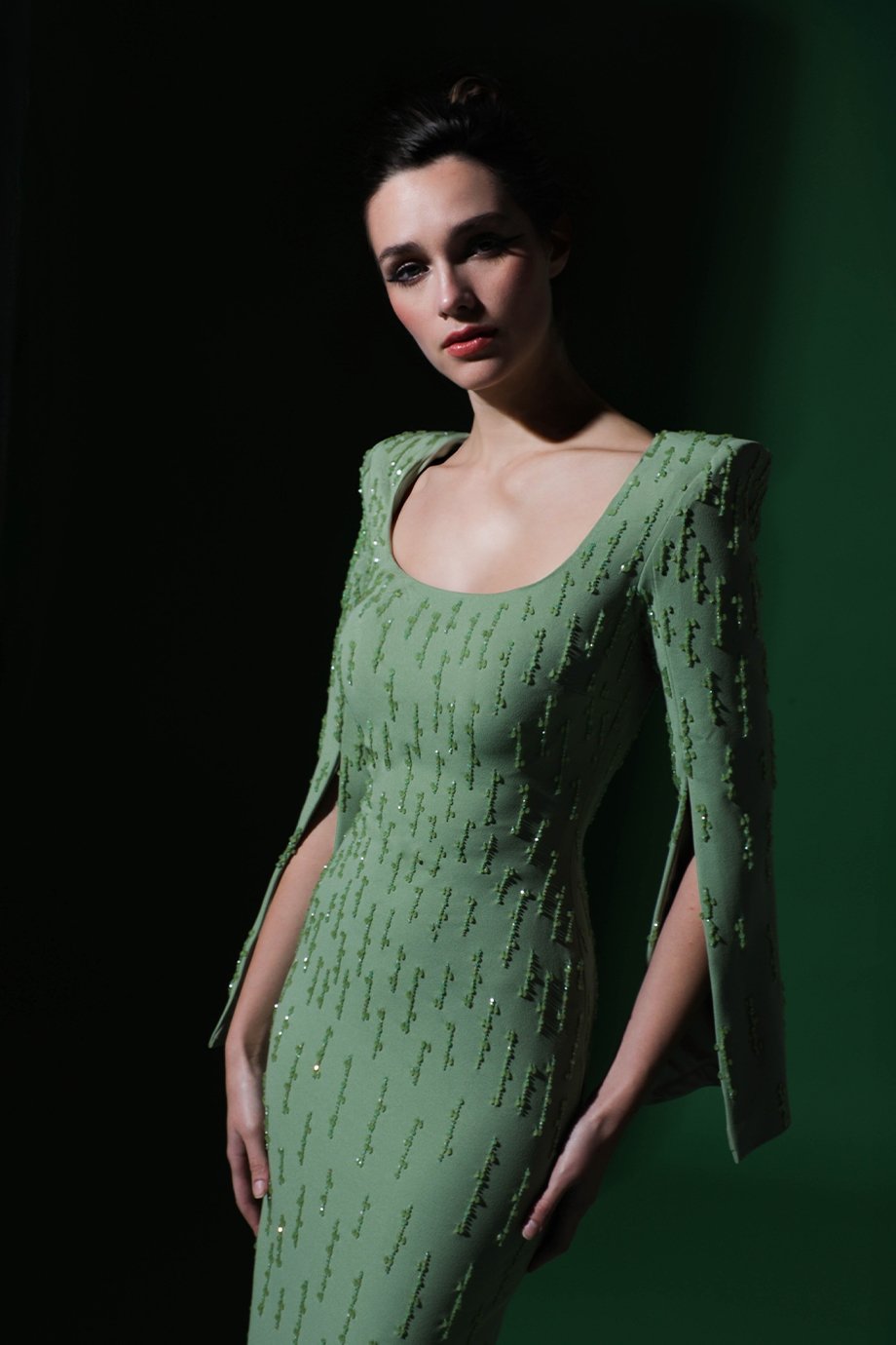 Crafted from lycra crepe, this straight-cut dress features long sleeves with high slits and structured shoulders for a bold silhouette. Finished with intricate beaded hand embroidery.