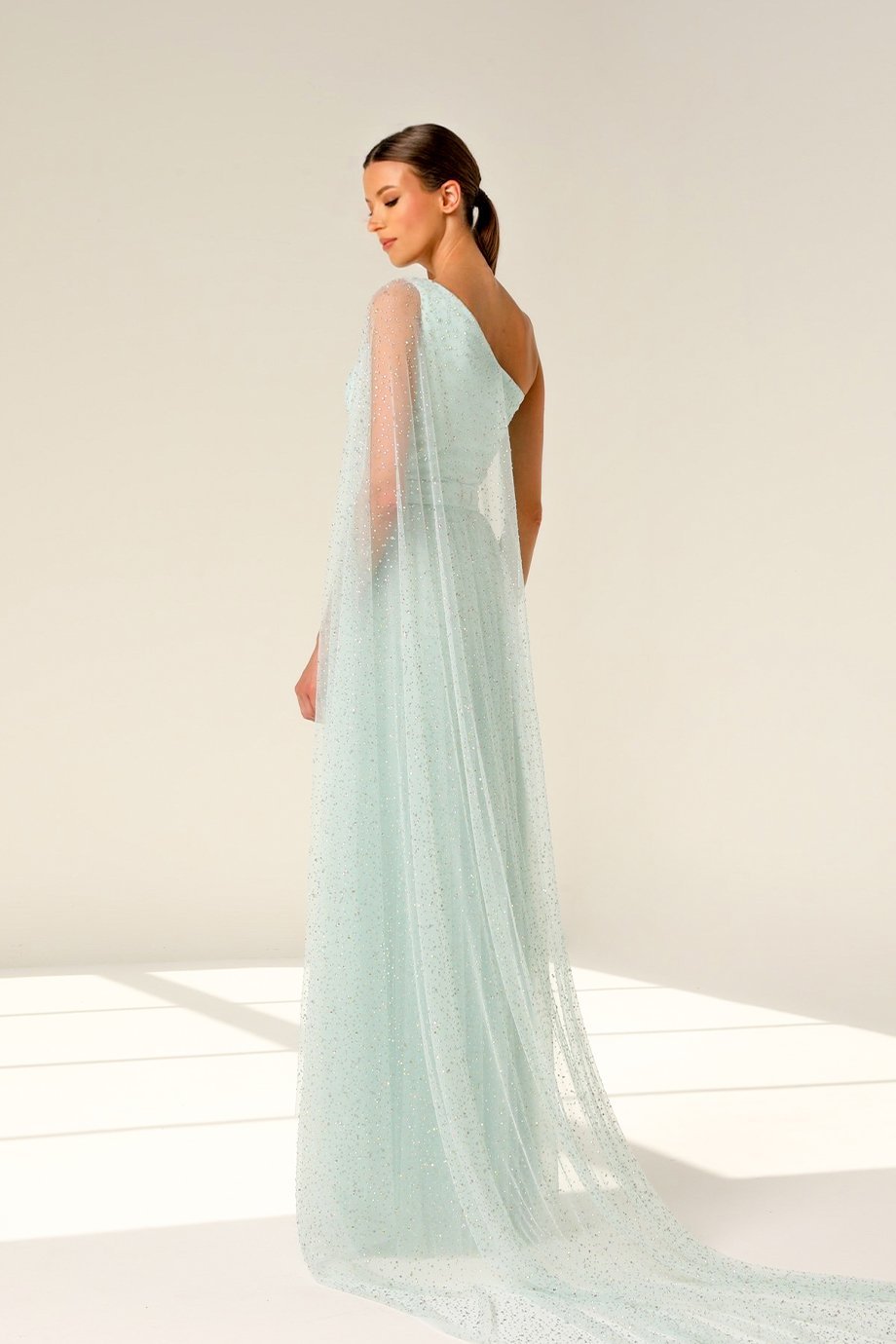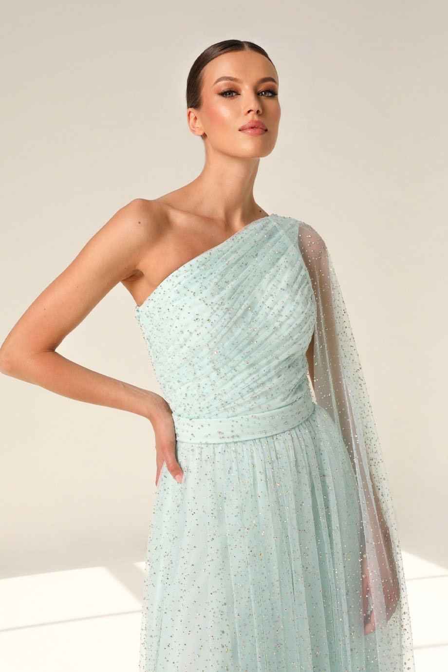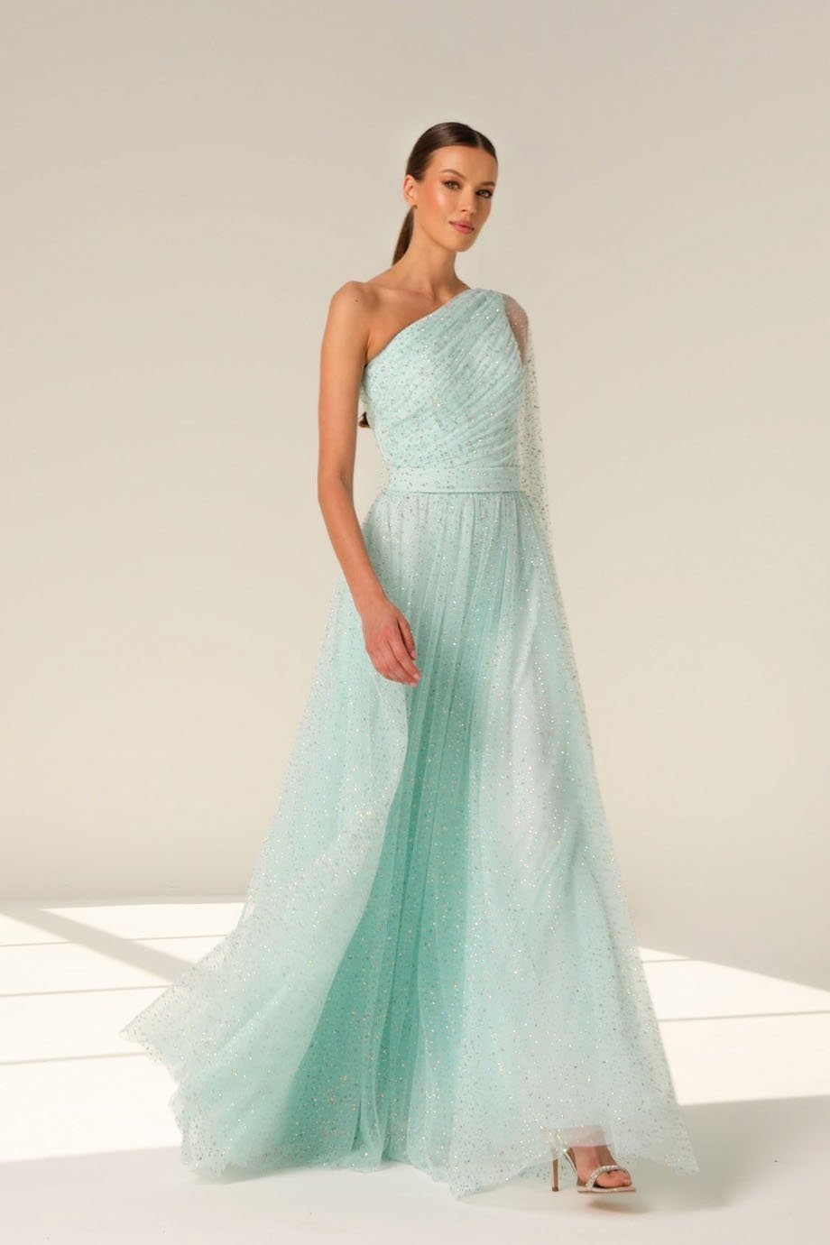 Step into the spotlight with our stunning one-shoulder evening gown, designed to make you the center of attention at any formal occasion. The gathered neckline adds a touch of effortless sophistication, perfectly accentuating your natural grace. Whether you’re attending a gala or an upscale dinner, this dress ensures you’ll always leave a lasting impression.