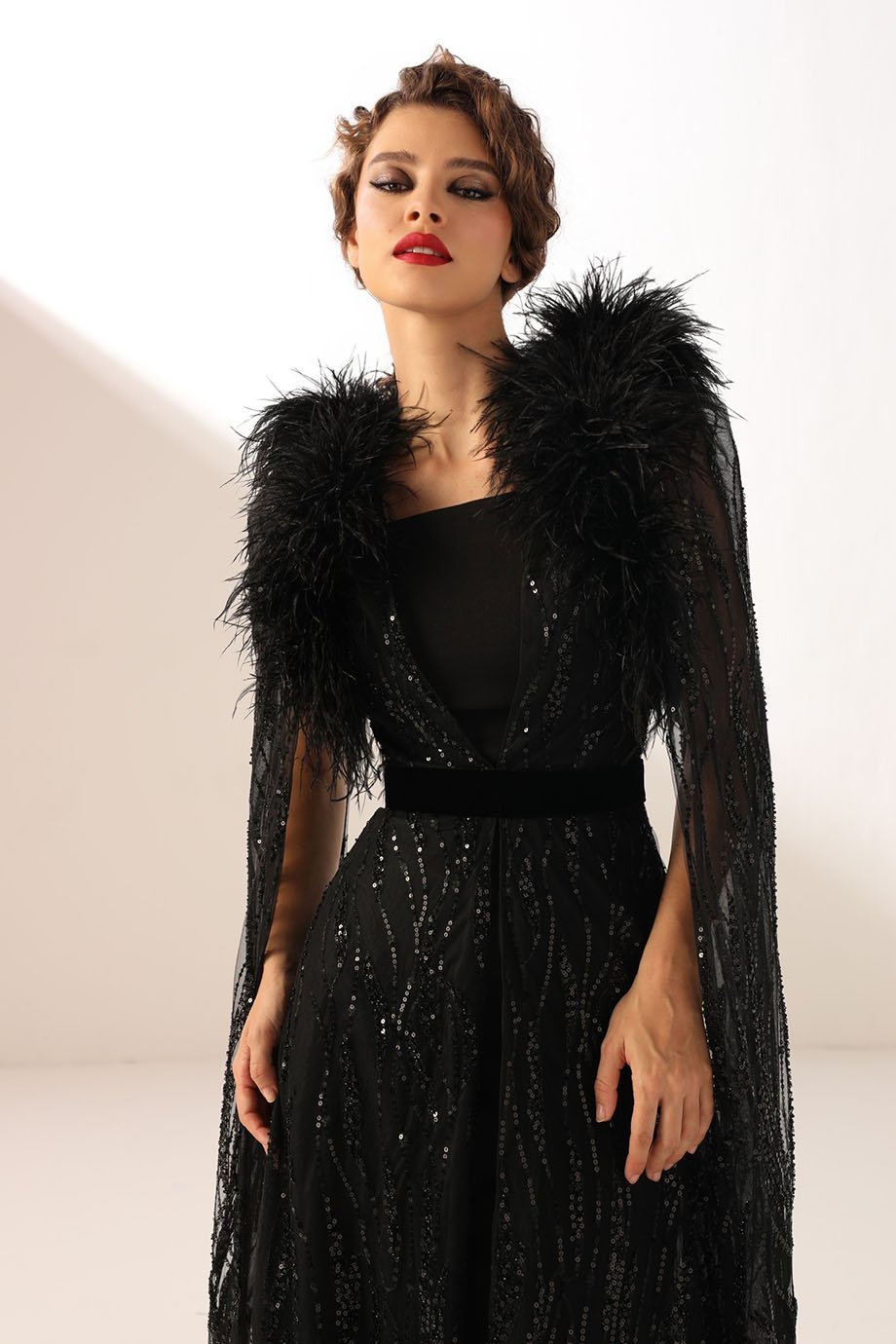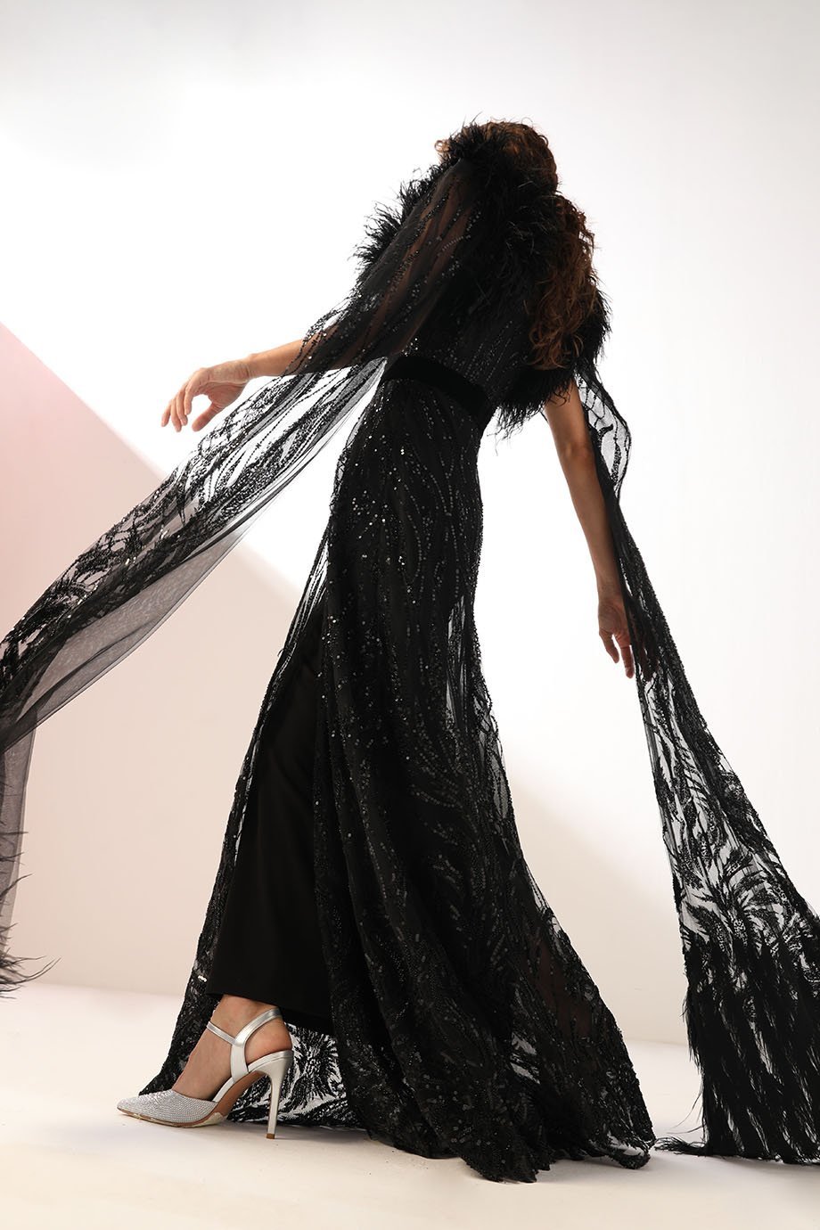 The kaftan adds an extra layer of glamour with its evening length and unique v-neckline. Made with sheer feather fabric, it dazzles under the light, thanks to intricately placed stone sequins and bead embellishments. This elegant overlay elevates the ensemble, giving it an opulent and graceful finish.