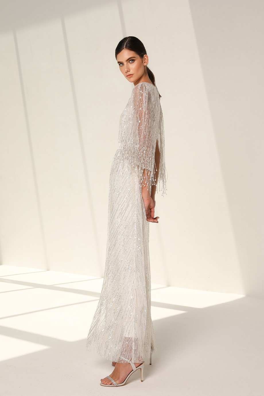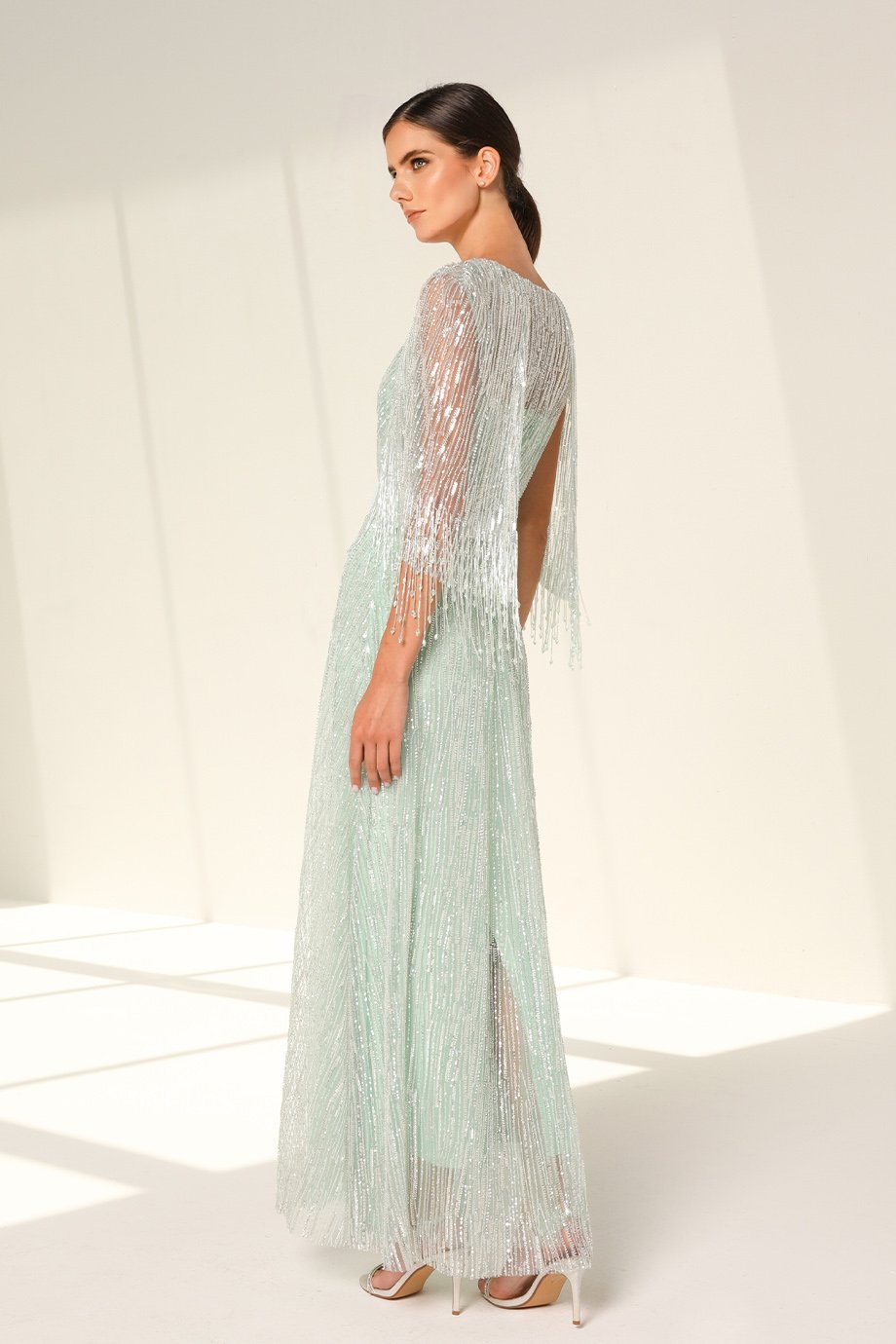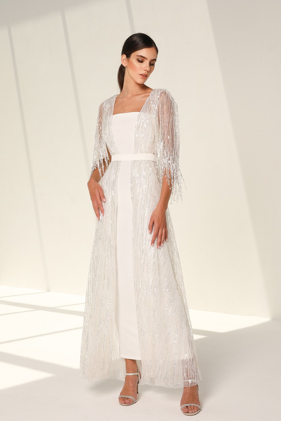 The inner dress features a scuba pencil cut silhouette, with a straight-across neckline that flatters your form. This midi-length foundation pairs seamlessly with the outer kaftan, which is an evening-length masterpiece adorned with stone sequins and beadwork. The V-neckline and cape-style crystal tassel sleeves evoke grace and movement, while the velvet belt adds a luxurious finishing touch. Every detail reflects the finesse of handmade craftsmanship.