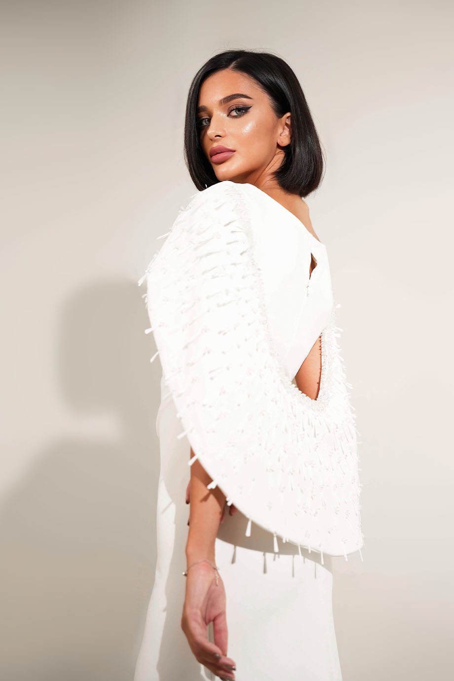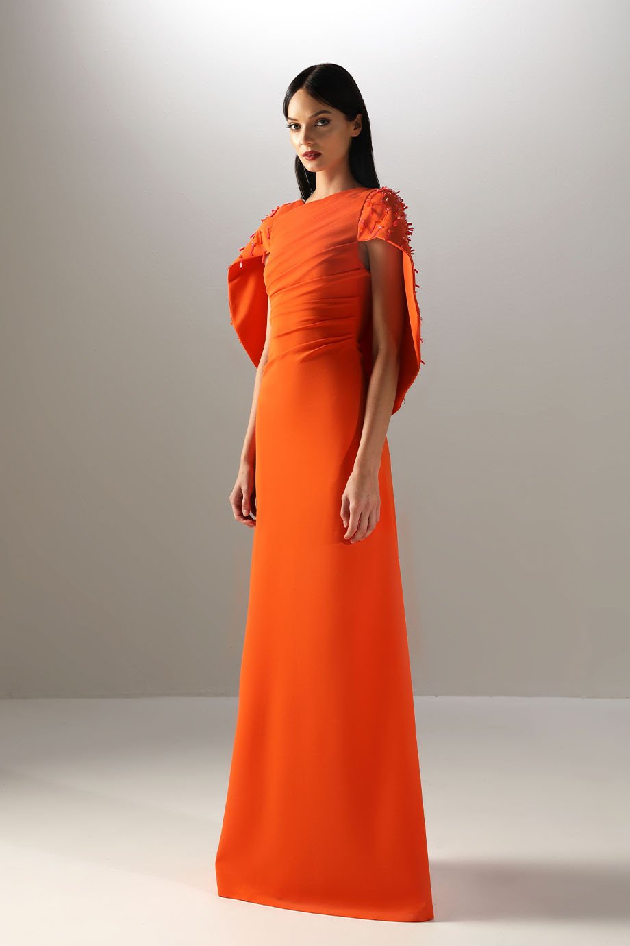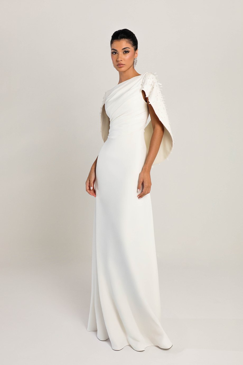 - Crepe sheath draped dress with hand-embroidered shoulder