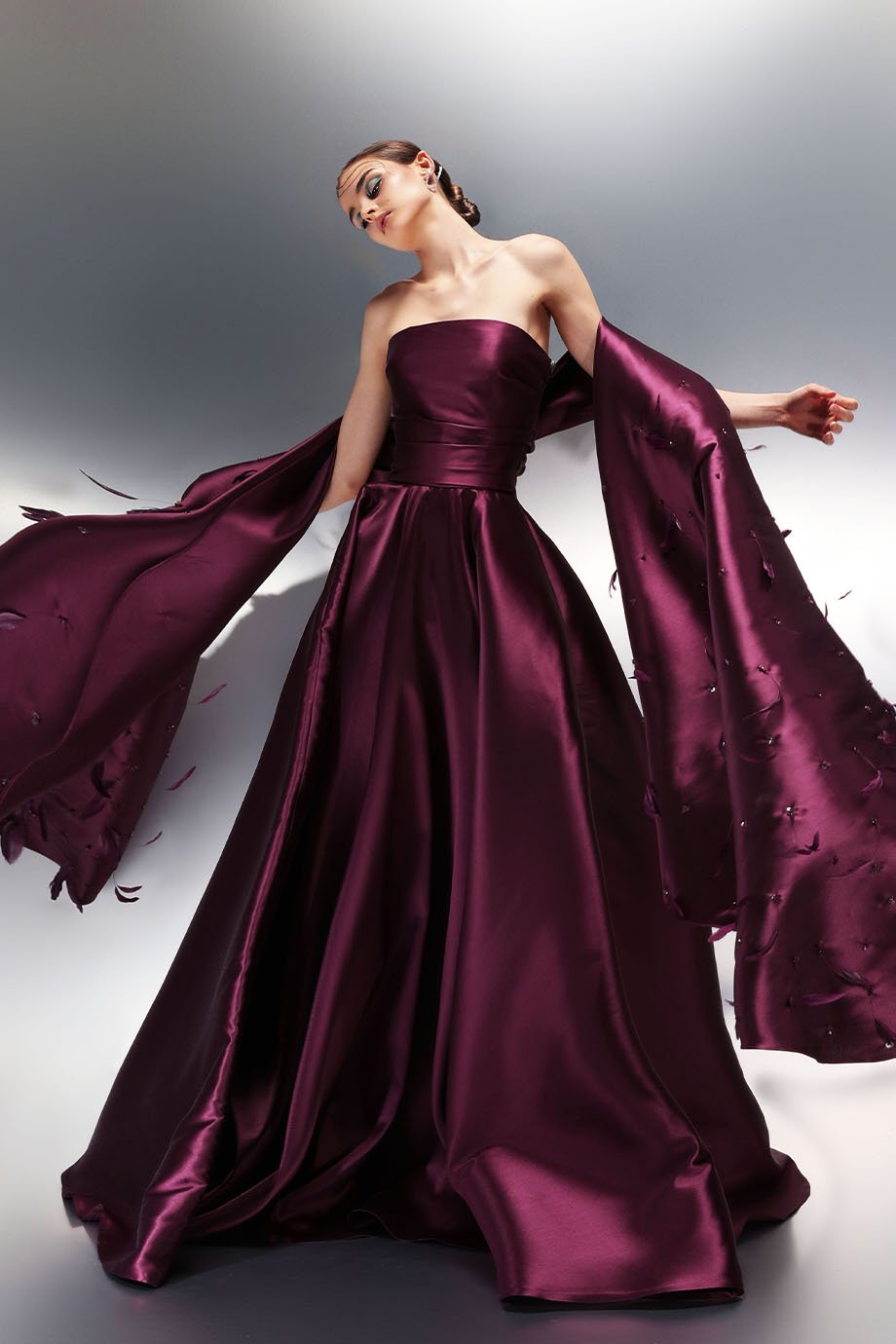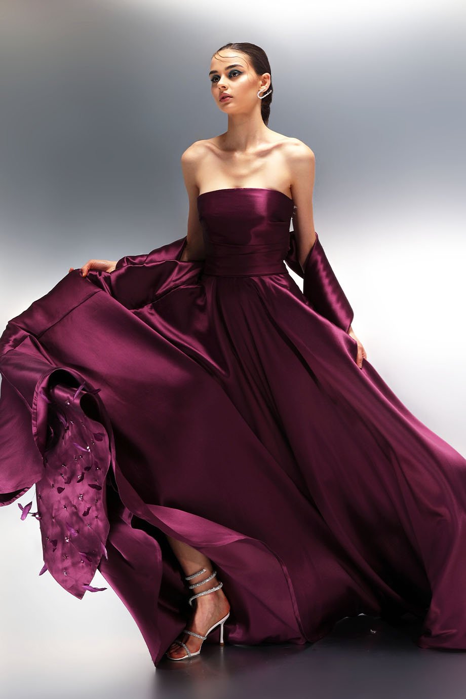- Taffeta draped gown with a back-hand embroidered shawl