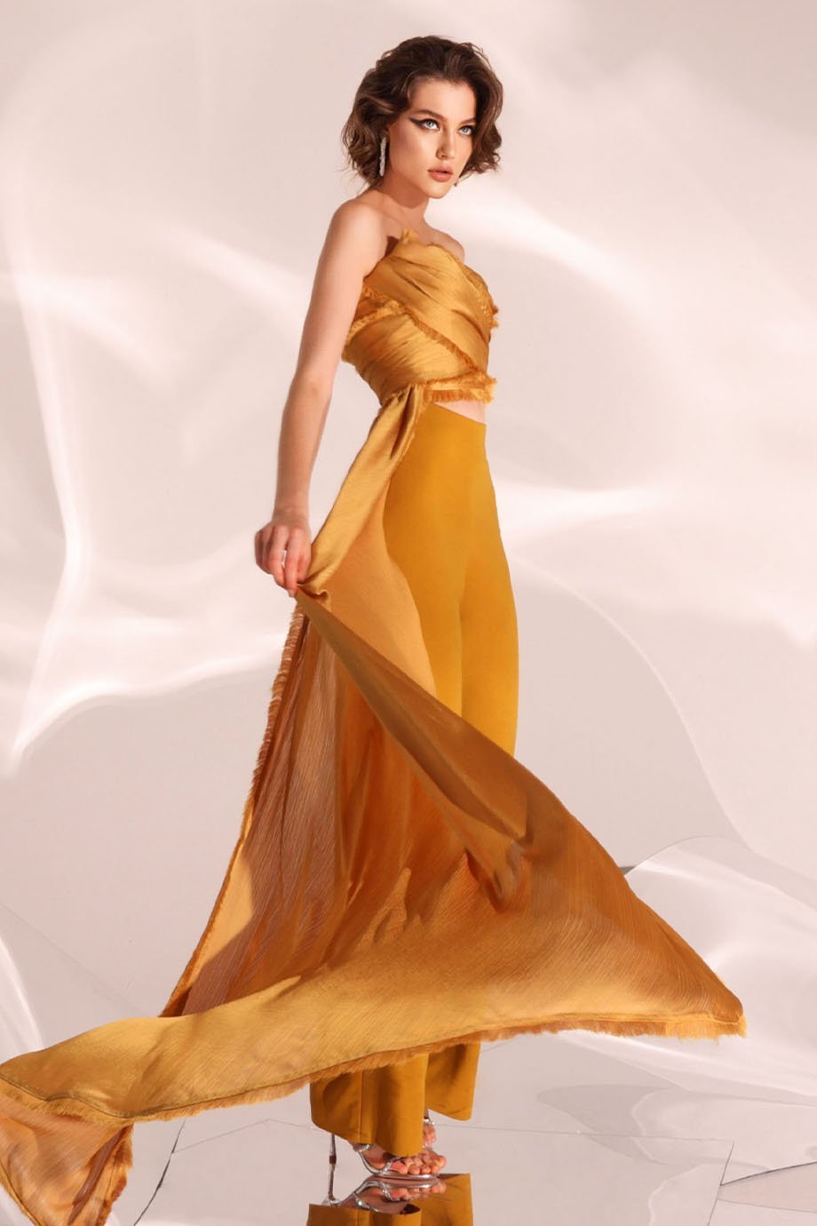 The top is made from high-quality crushed chiffon, offering a rich texture and a lightweight feel that exudes sophistication and grace. The light neo-crepe fabric used for the pants ensures exceptional comfort without compromising on style, giving you the freedom to move while looking effortlessly put together.