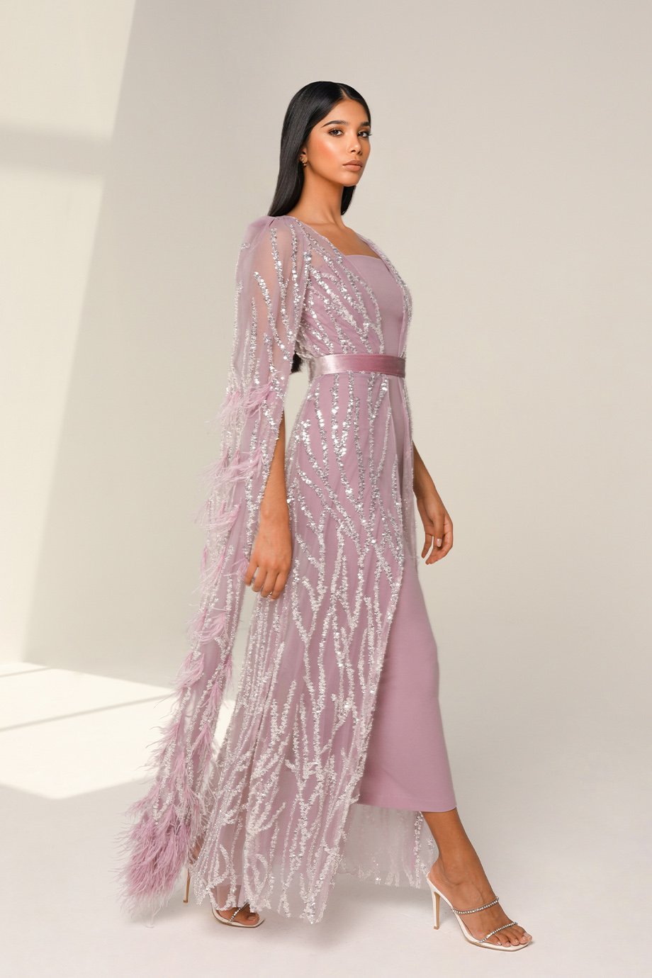 Showcasing a Sequins Stone Fabric that sparkles beautifully under the light, this dress epitomizes refined elegance. The delicate Ostrich Feathers add a touch of glamor, while the Stretchy Strapless Scuba Inner ensures a comfortable yet figure-hugging fit. Every detail, including the Velvet Belt that cinches in at the waist, adds a layer of charm to this stunning piece.
