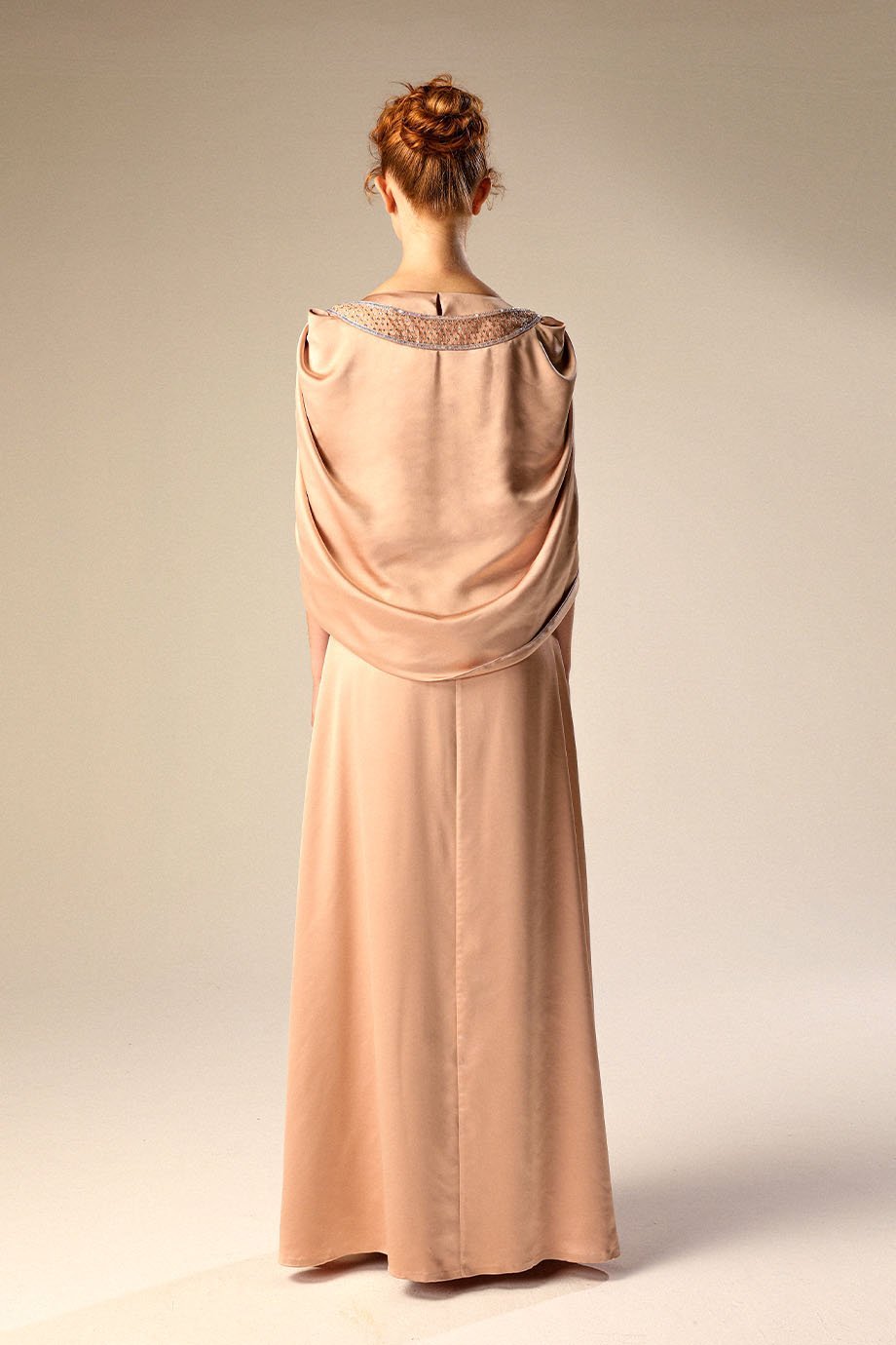 Introducing the epitome of sophistication: the Boat Neck Princess Dress with Capelet and Embroidered Waist, crafted meticulously in textured satin. Designed to exude timeless beauty, this stunning dress harmoniously blends classic elegance with modern charm, making it a standout piece for any special occasion.