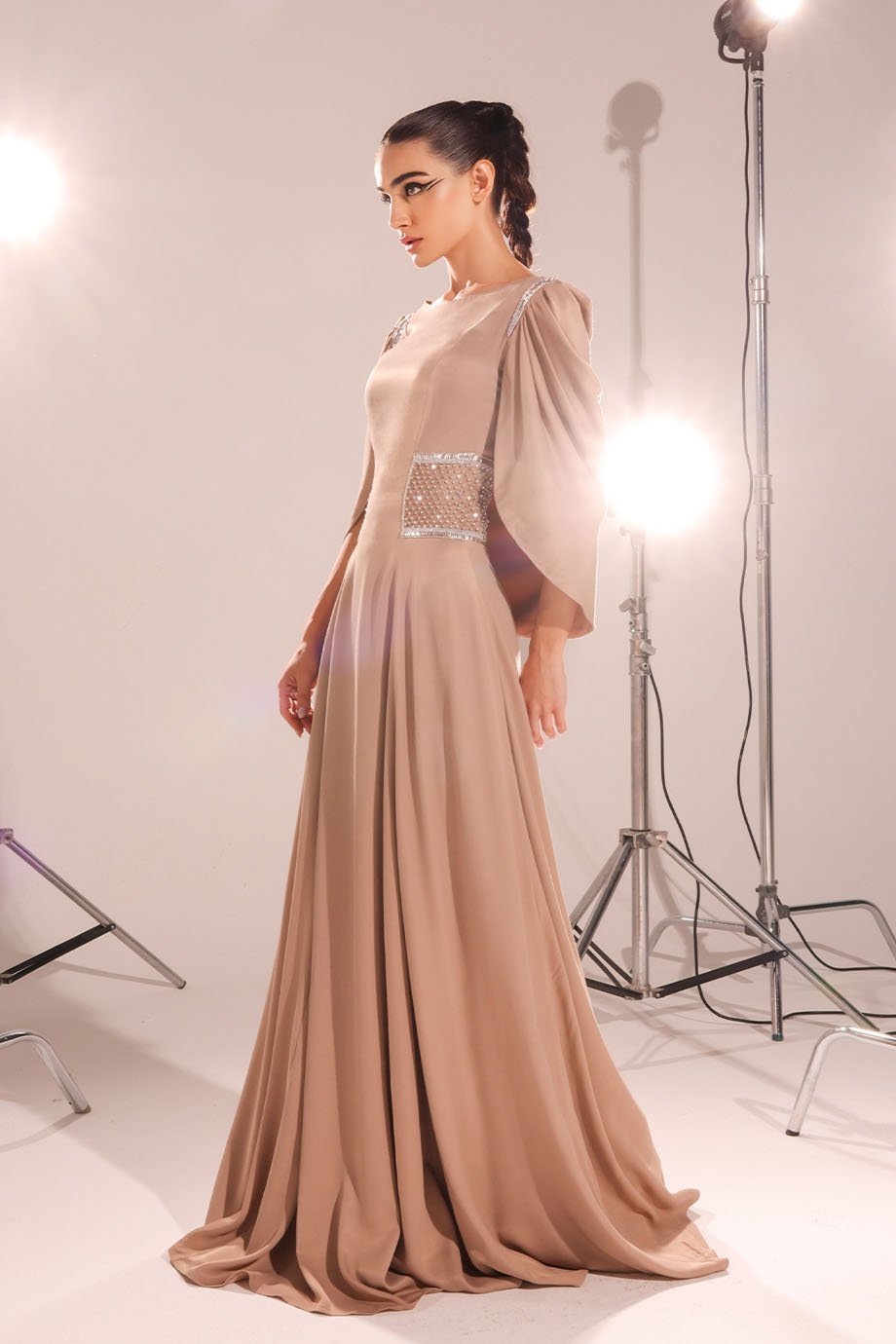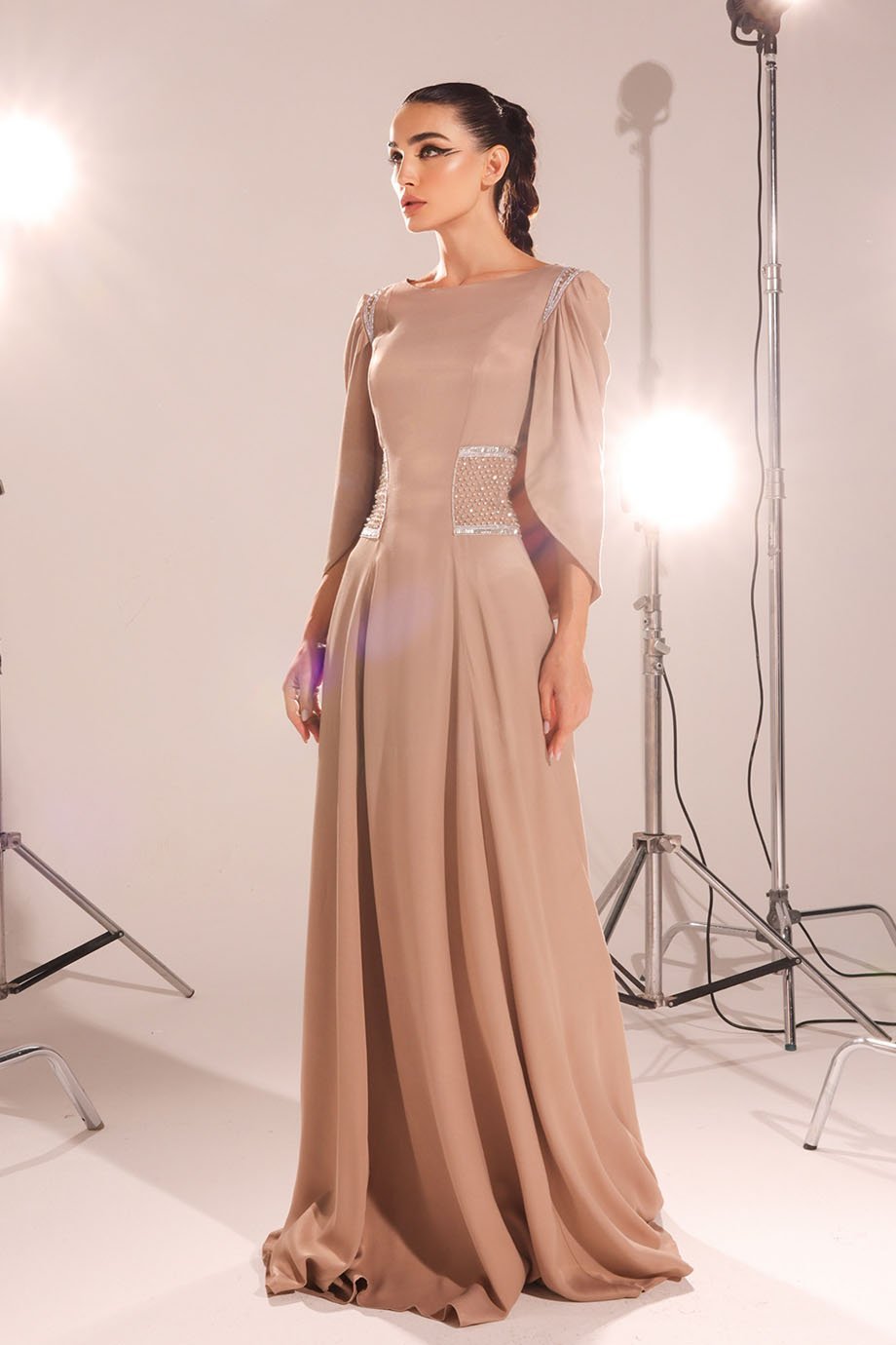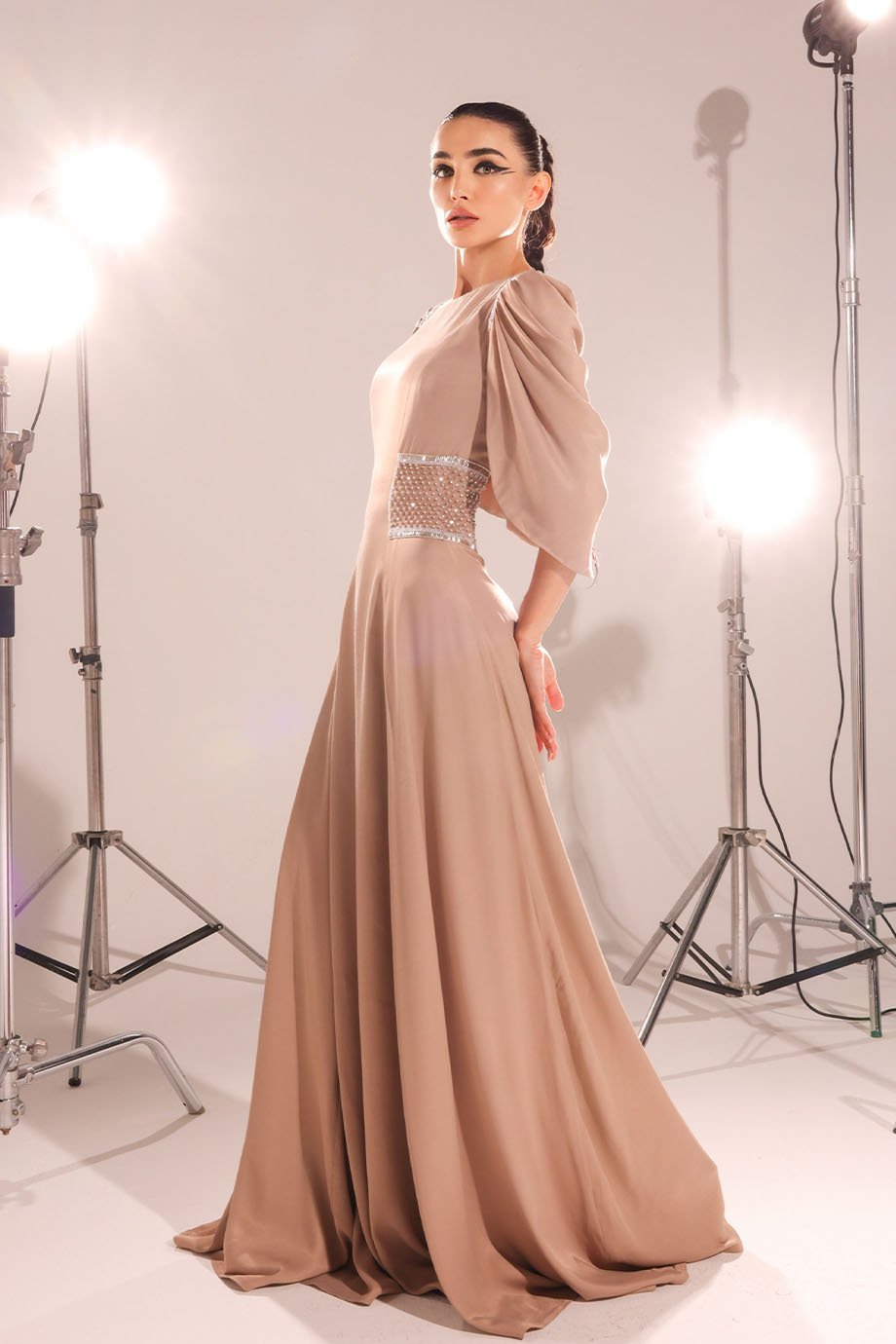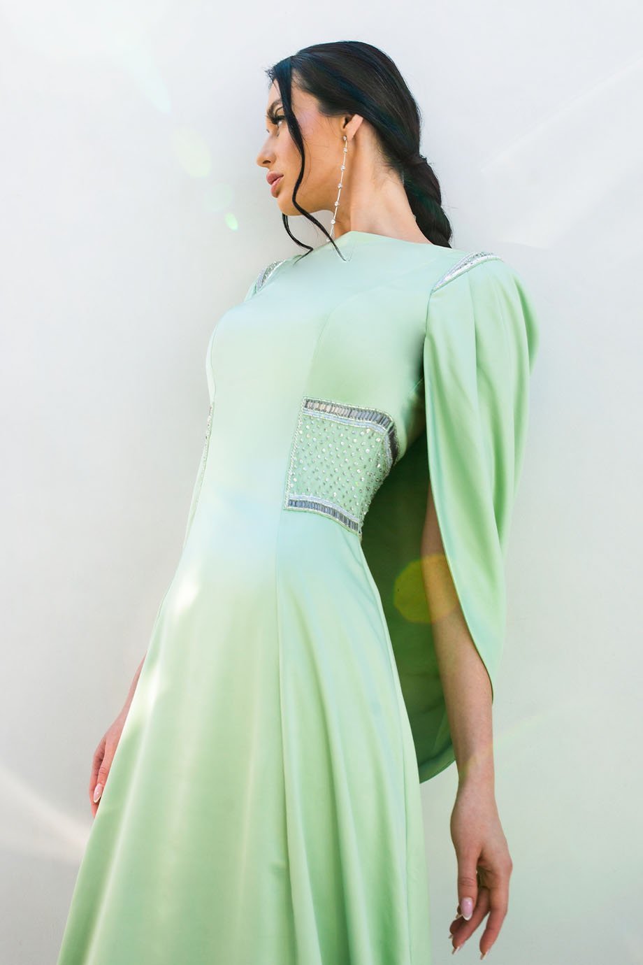 This dress is adorned with a graceful boat neckline, offering a refined and polished look that flatters all body types. The capelet detailing adds a touch of drama, effortlessly elevating the design into an unforgettable statement piece. The embroidered waist enhances your silhouette, creating a flattering fit while showcasing intricate craftsmanship that truly stands out.