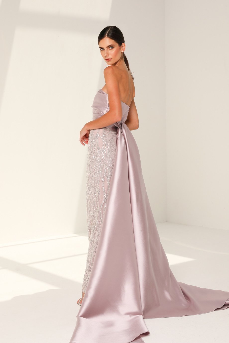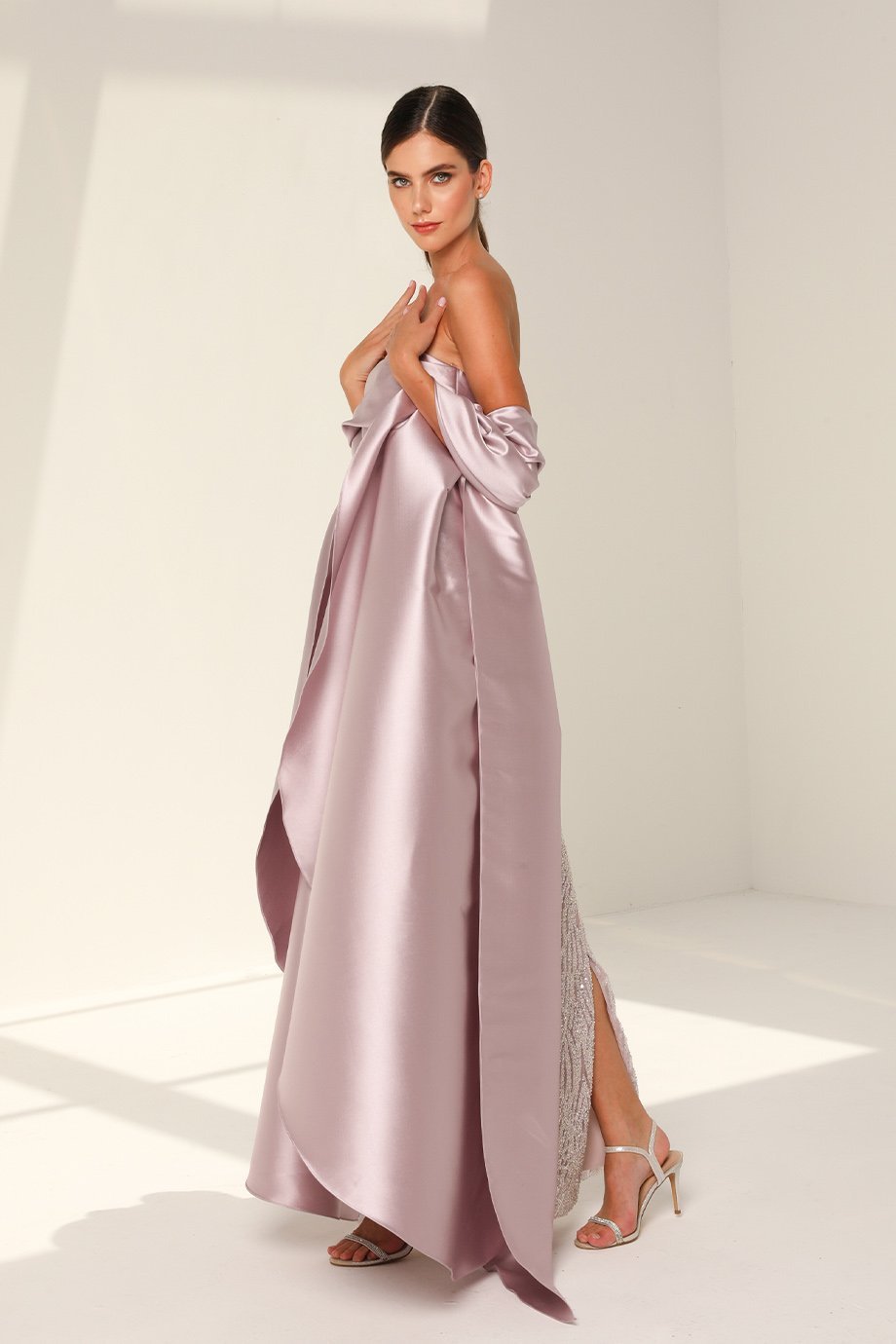 This full-length straight-cut gown is crafted from premium stone and sequins fabric, offering a luminous shine and intricate detailing. The gathered tafta neckline creates a chic focal point, accentuating your natural beauty while providing a touch of finesse. Its straight cut ensures a flattering silhouette, combining contemporary trends with classic appeal.