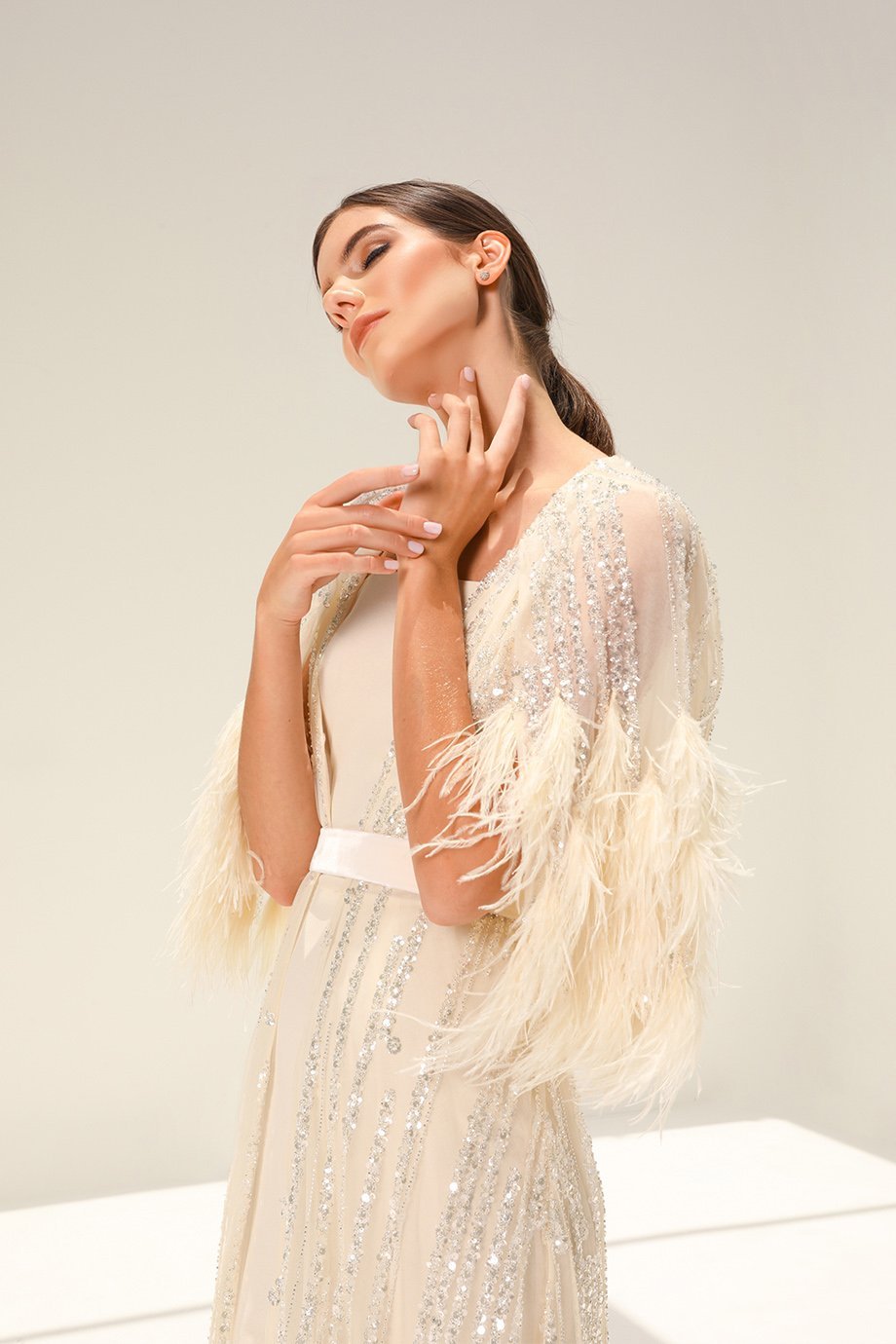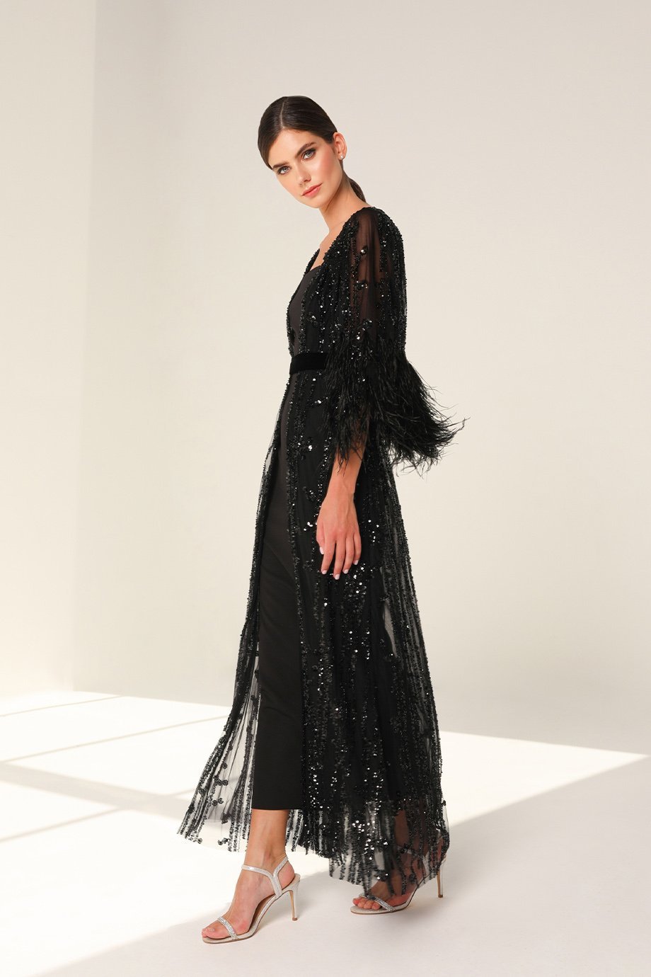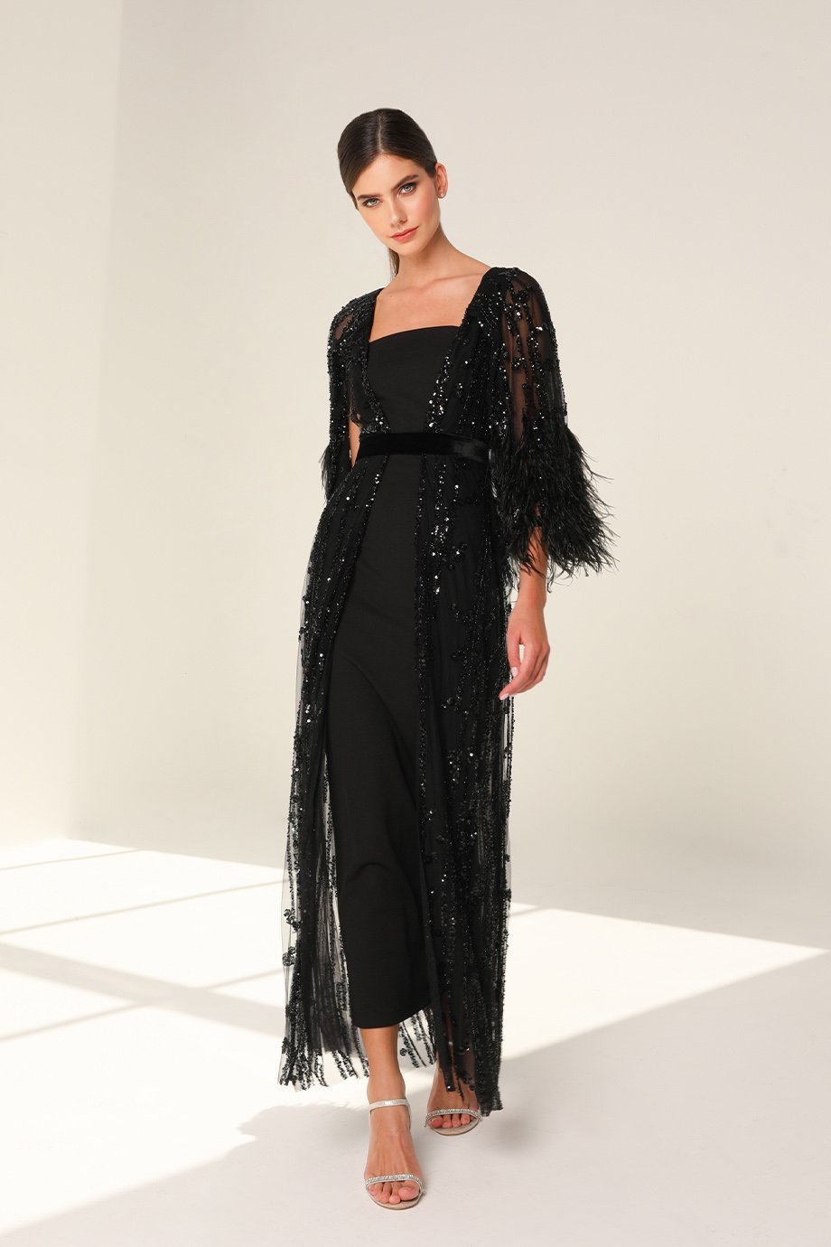 Designed with luxury in mind, this kaftan is crafted from high-quality sequins stone fabric, creating a shimmering effect that catches the light beautifully. The deep V-neckline adds a touch of allure, complemented by short cape sleeves that drape elegantly on your shoulders. Further enhancing the look, ostrich feather accents provide a soft, luxurious texture, while the velvet belt cinches the waist perfectly, offering a flattering silhouette.