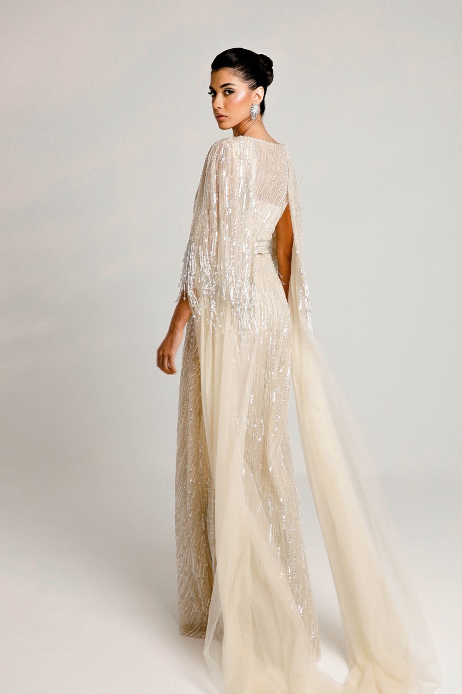 The inner dress boasts a scuba pencil-cut silhouette with a straight-across neckline, delivering a perfect balance of comfort and chic appeal. Its midi length complements the sleek profile, making it suitable for fashionable layering. The overlying kaftan features a striking V-neck design and evening-length flow adorned with intricate beadwork, sequins, and handmade tassels. Made from luxe tulle fabric, it imbues the outfit with a sense of grandeur and artistic refinement.