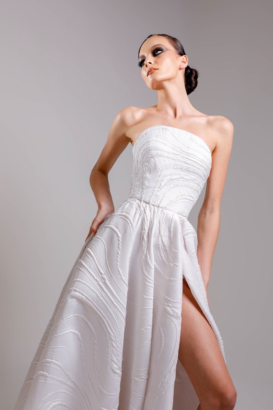 Every detail of this gown is a tribute to fine craftsmanship. Adorned with intricate handmade embellishments, it radiates sophistication and charm. The thoughtful detailing elevates the gown, ensuring that it stands out in any crowd and leaves an unforgettable impression.