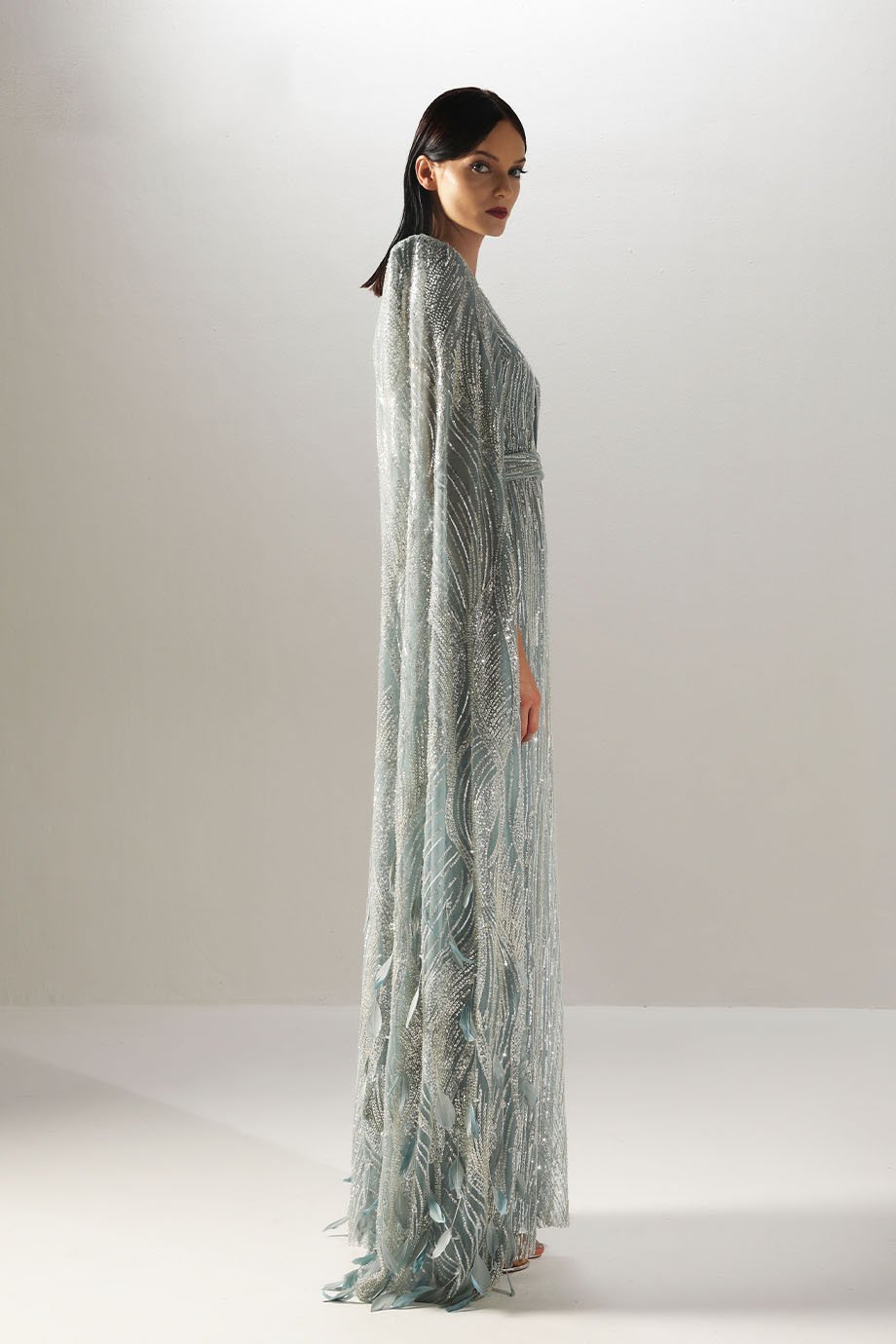 - Embroidered tulle kaftan, feather crystal hand-embroidered sleeves