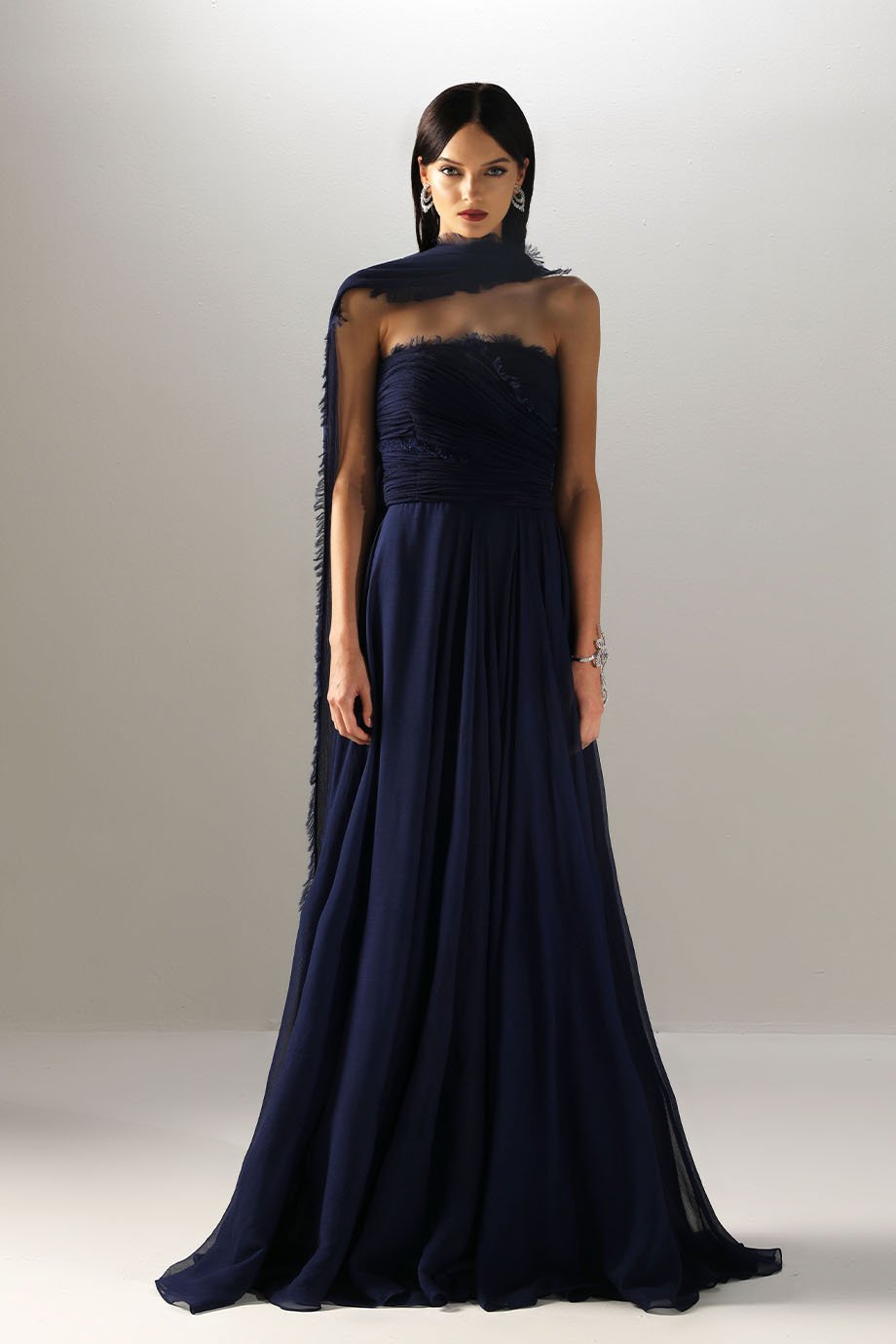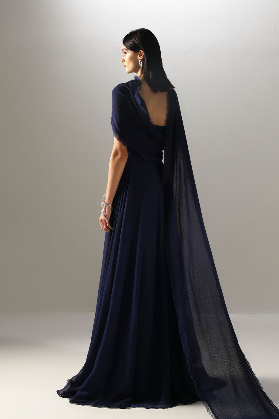 - Hand-draped textured chiffon, side slit dress with attached back side shawl, floor length dress.