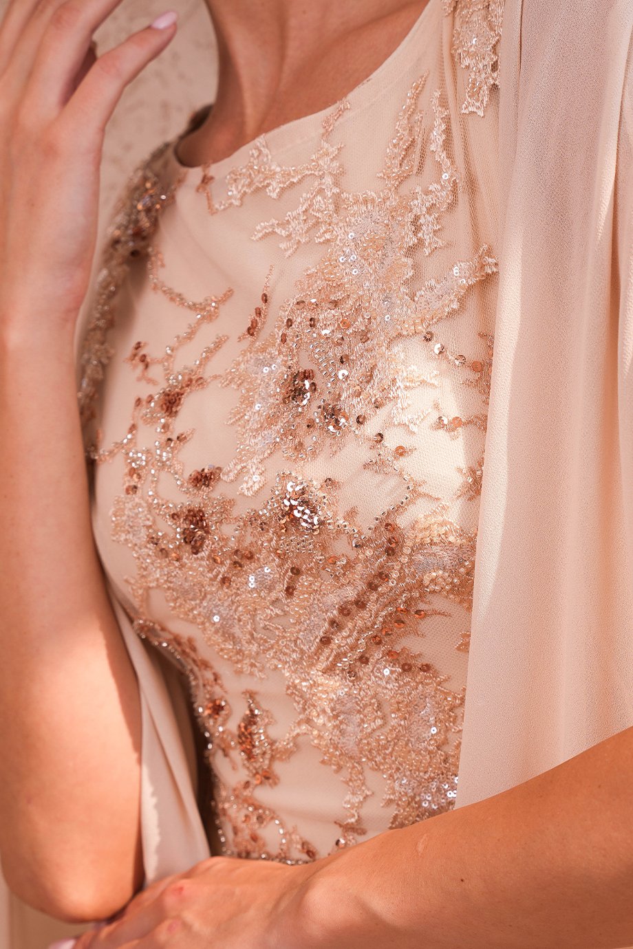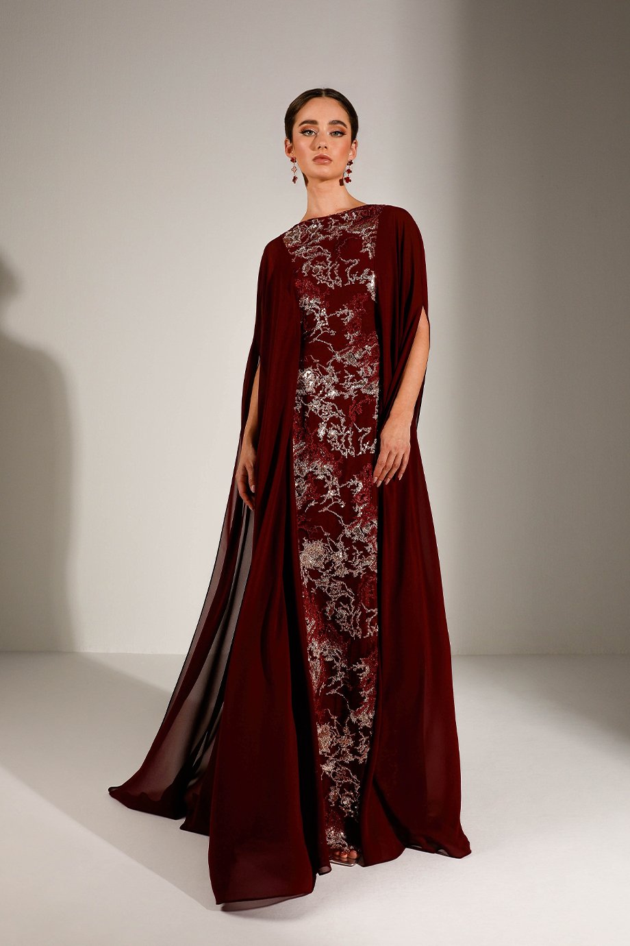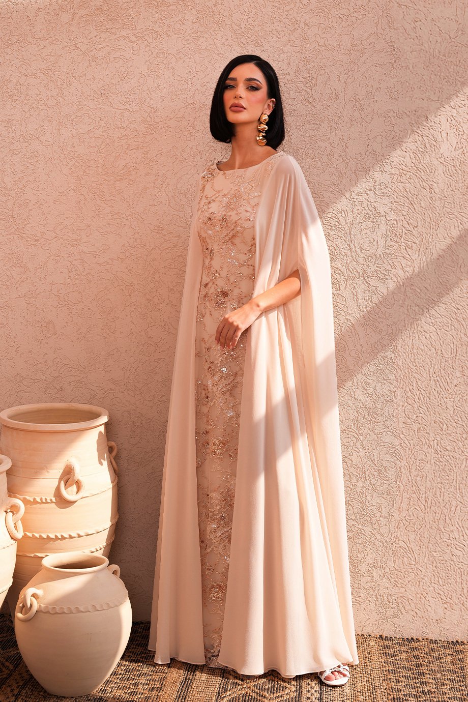 An inner A-cut scuba dress topped with a chiffon kaftan style, enhanced with elegant fancy fabric detailing.