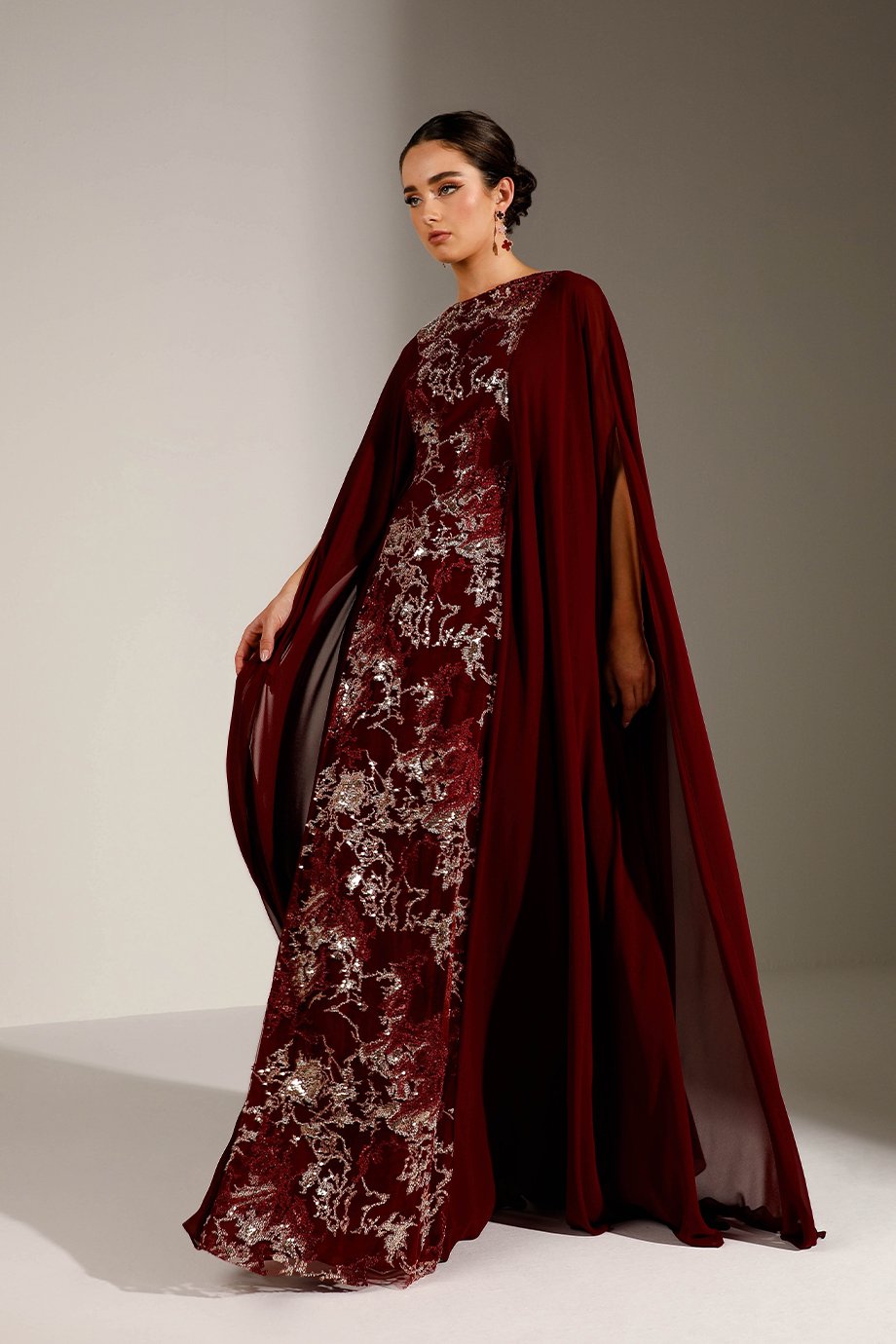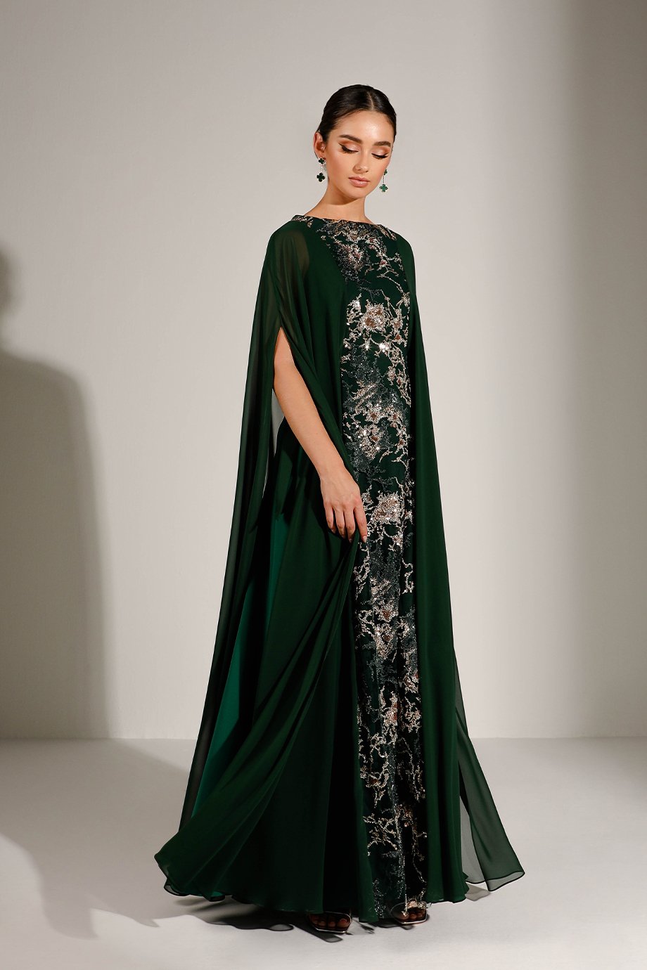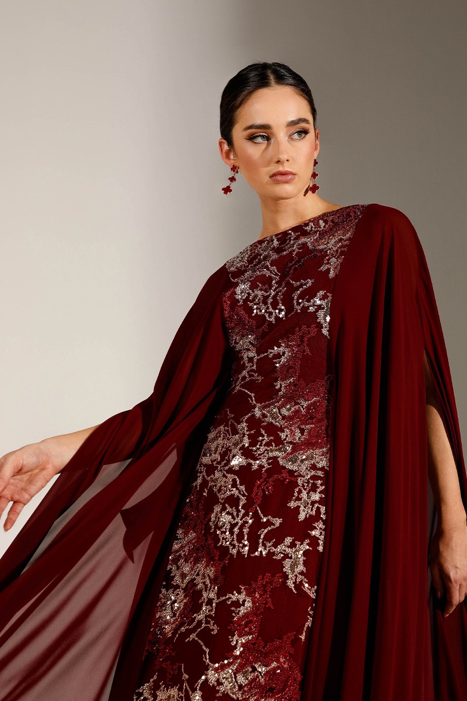 An inner A-cut scuba dress topped with a chiffon kaftan style, enhanced with elegant fancy fabric detailing.