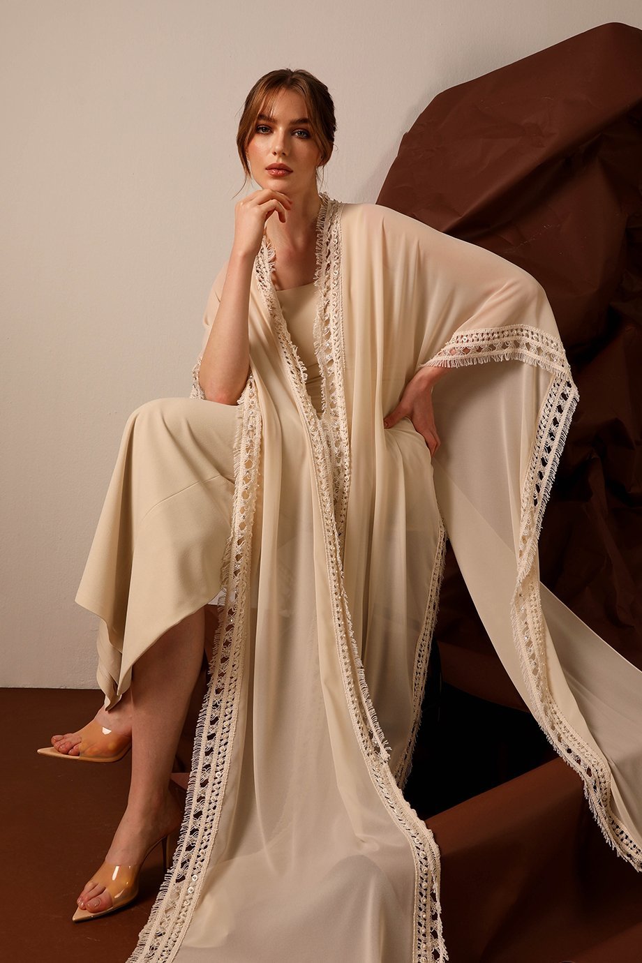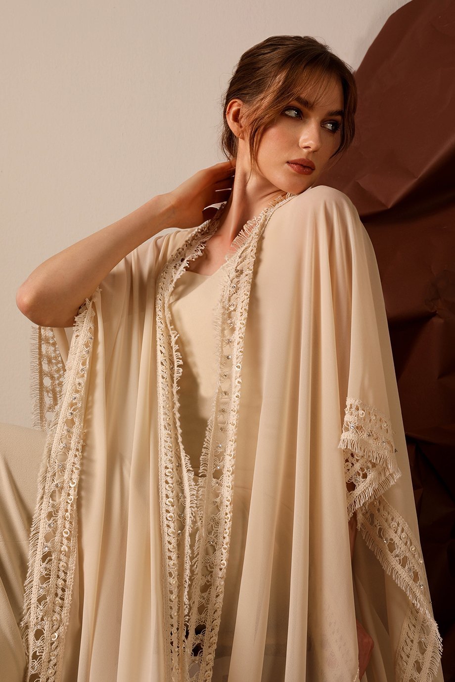 Cape is crafted from chiffon with a full crochet border adorned with handmade embellishments of pearls, crystals, and beads, and the dress is made from lycra crepe fabric.