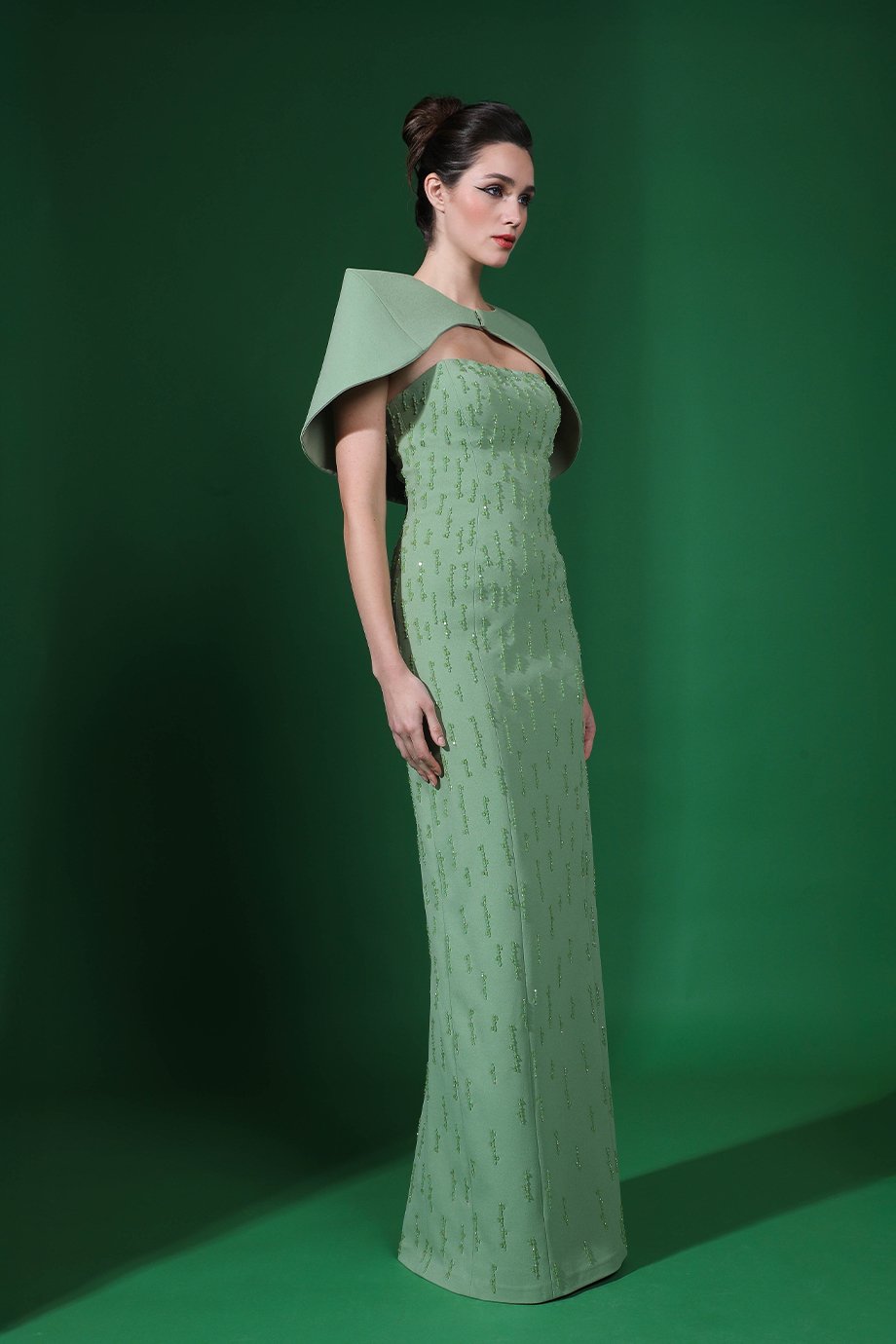This straight-cut dress in lycra crepe features an exaggerated shoulder capelet, adding a dramatic flair. Enhanced with intricate beaded and crystal hand embroidery, it perfectly balances bold structure with delicate detail.