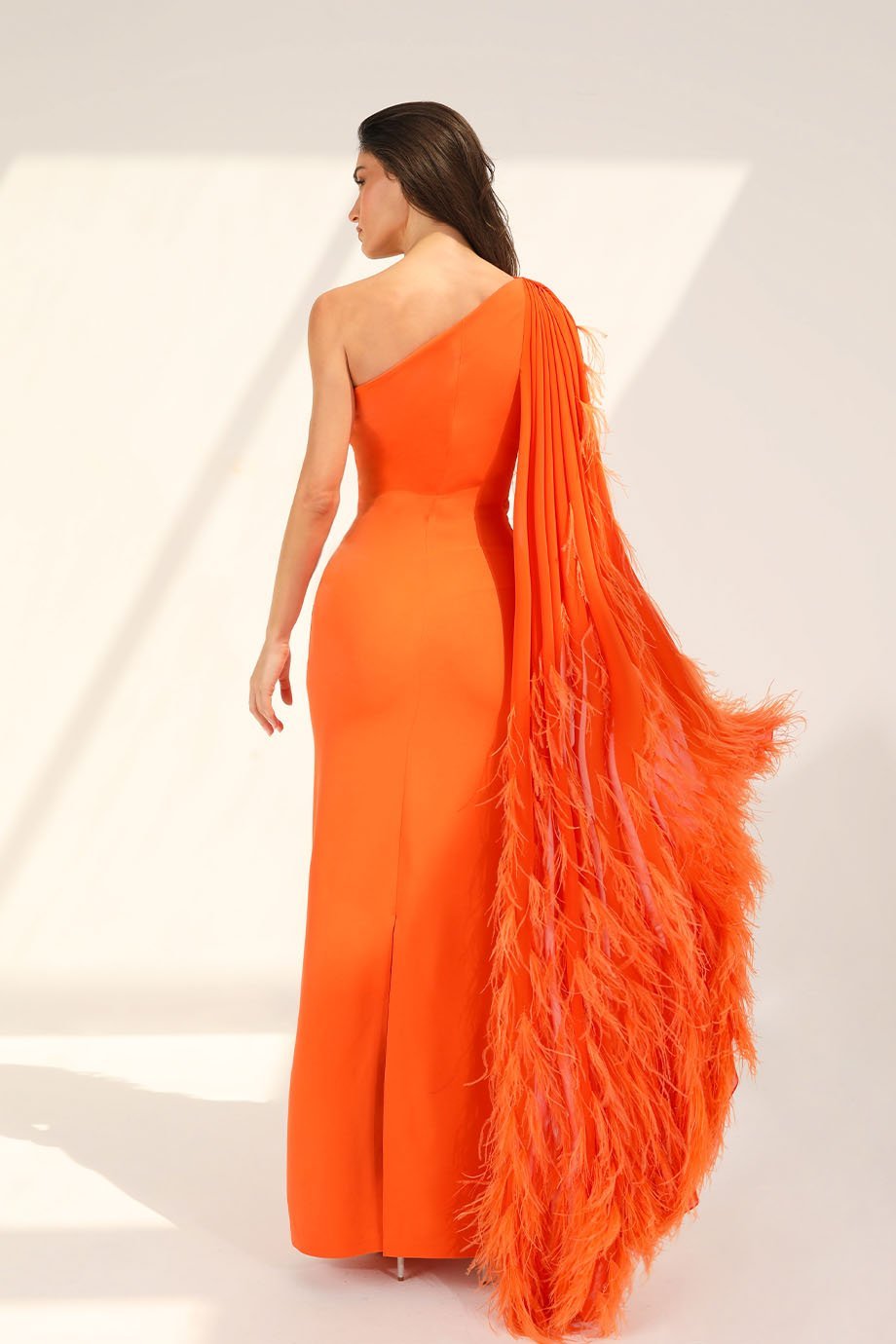 Made from luxurious scuba fabric, this evening gown ensures both elegance and comfort. The fabric’s refined texture drapes beautifully while providing ease of movement, perfect for long events. The one-shoulder design is complemented by an asymmetric feather detail on the sleeve, a handmade touch that adds a distinctive flair to the overall look.