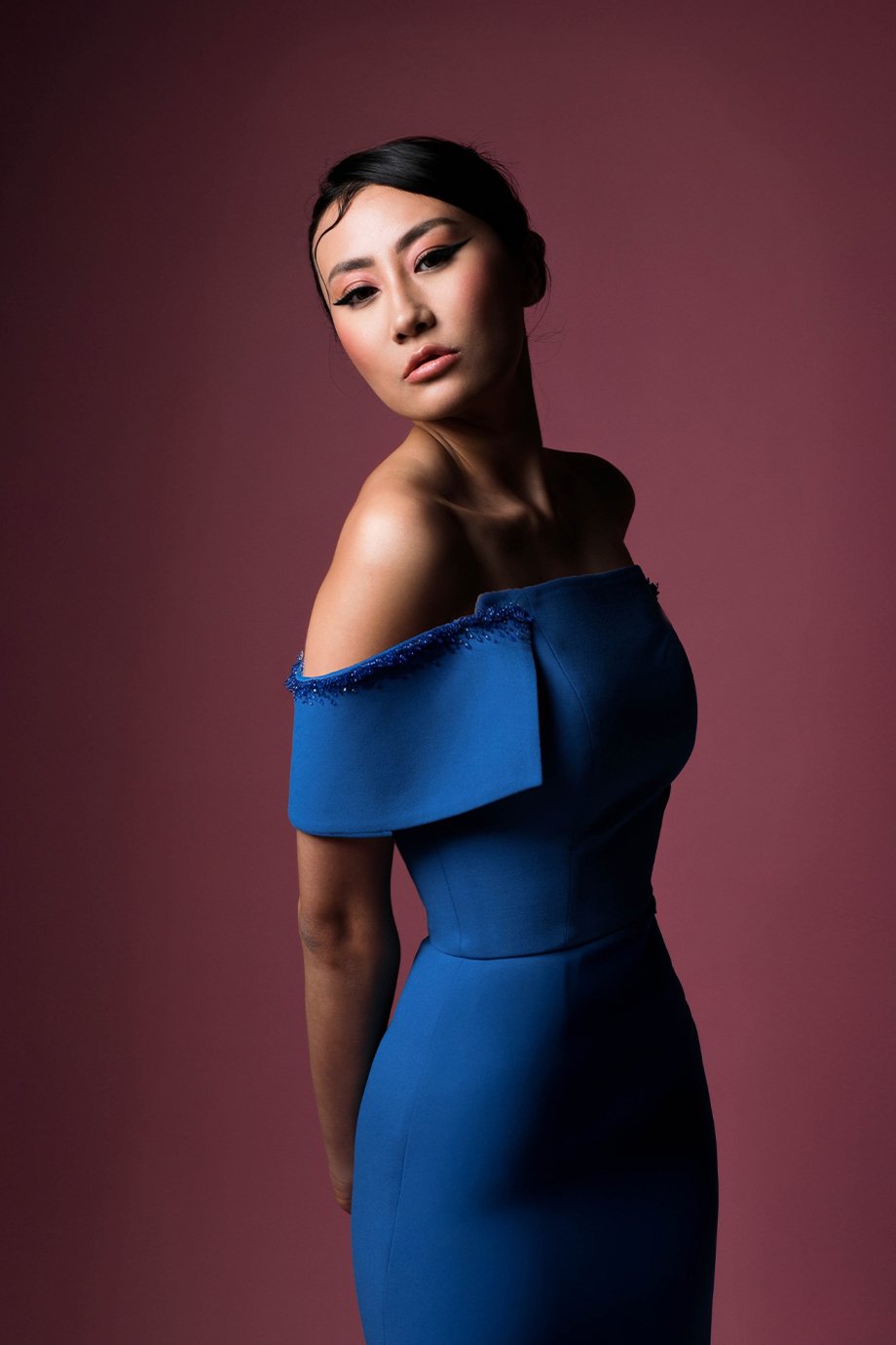 This off-shoulder straight-cut dress in lycra crepe features two side slits for added movement and allure. Enhanced with delicate crystal and beaded hand embroidery, it blends sophisticated design with exquisite detail.
