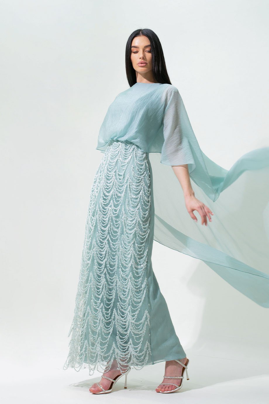 Transform your wardrobe with our captivating cape kaftan, an epitome of timeless elegance and modern chic. Designed for those who value style and comfort, this kaftan features a delicately tucked waist detail that enhances your silhouette while ensuring effortless wear for any occasion.