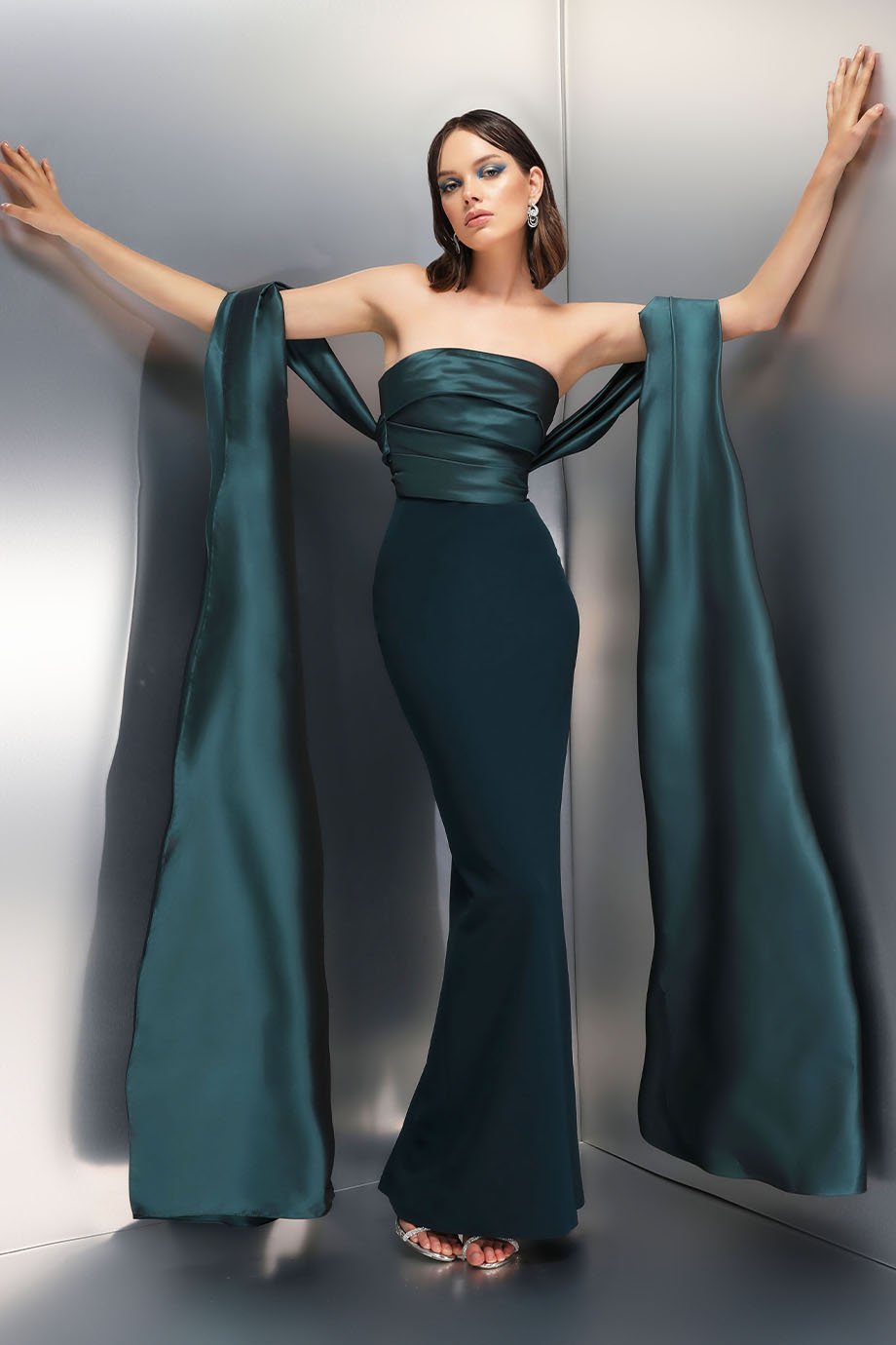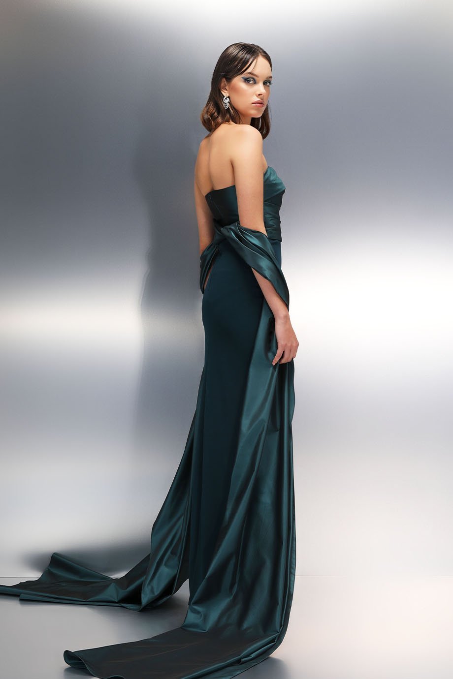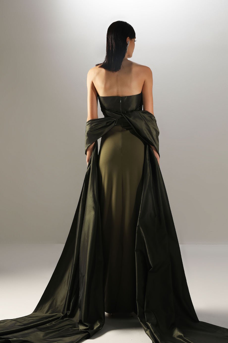 Designed to elevate your evening wear, this dress features an attached back shawl that flows beautifully, adding a dramatic and glamorous touch to your outfit. Whether it’s a red carpet event, a gala dinner, or an elegant soirée, the shawl enhances the ensemble with a soft, flowing movement that captures the essence of modern elegance. It’s a true statement piece that combines style and comfort seamlessly.