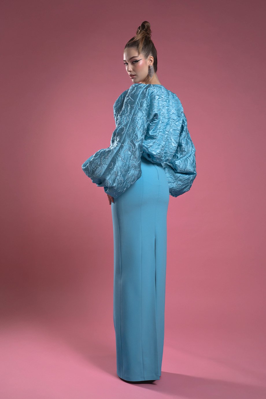A straight-cut strapless dress in lycra crepe paired with a jacquard fabric jacket featuring puffy-sleeved capelets. The jacket is exquisitely detailed with beaded hand embroidery, blending elegance with dramatic flair.