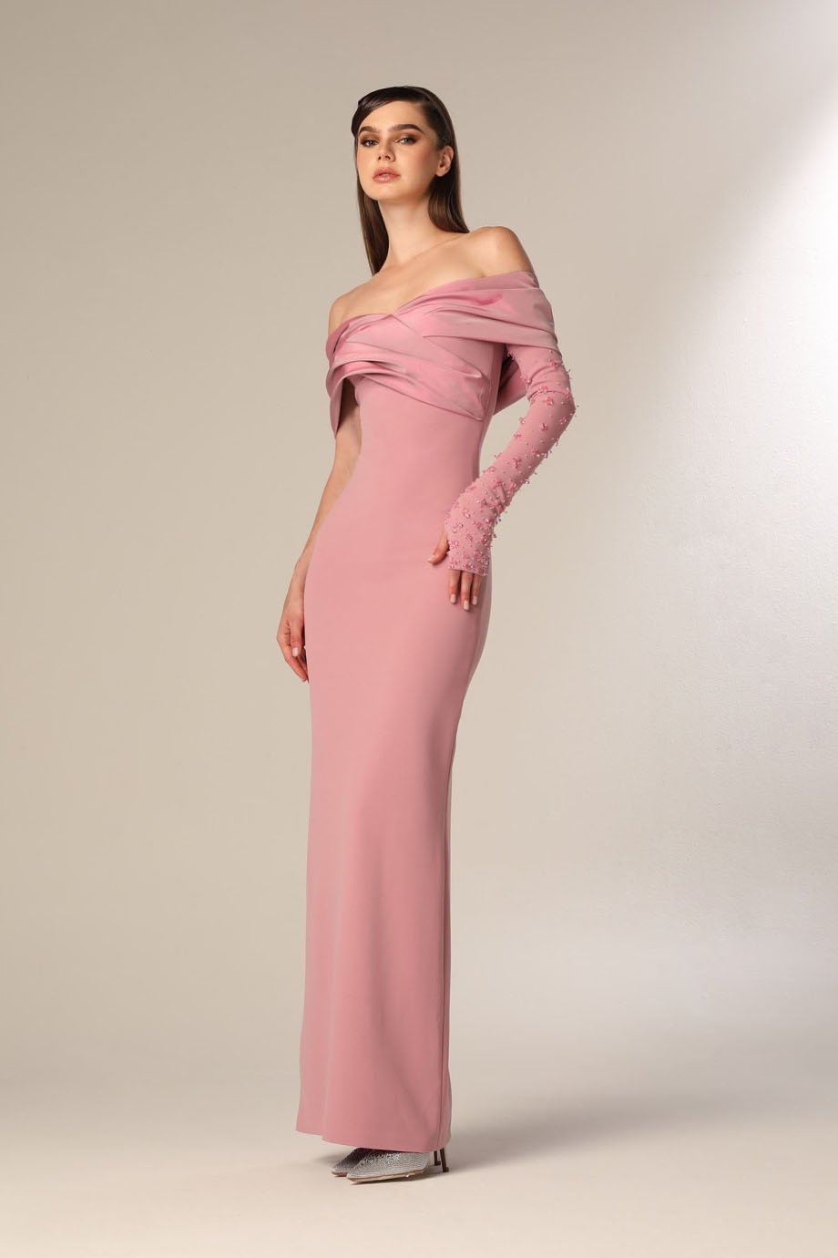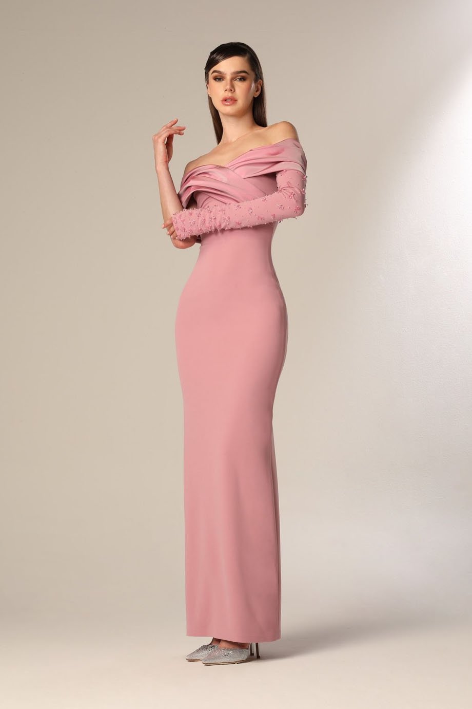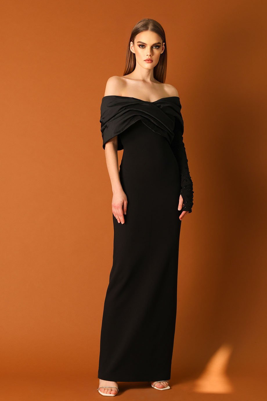 Make a lasting impression with our exquisite gathered tafta gown that combines chic design with luxurious details. Defined by its off-shoulder neckline and pencil cut silhouette, this evening-length dress beautifully highlights your every curve while exuding grace and elegance.