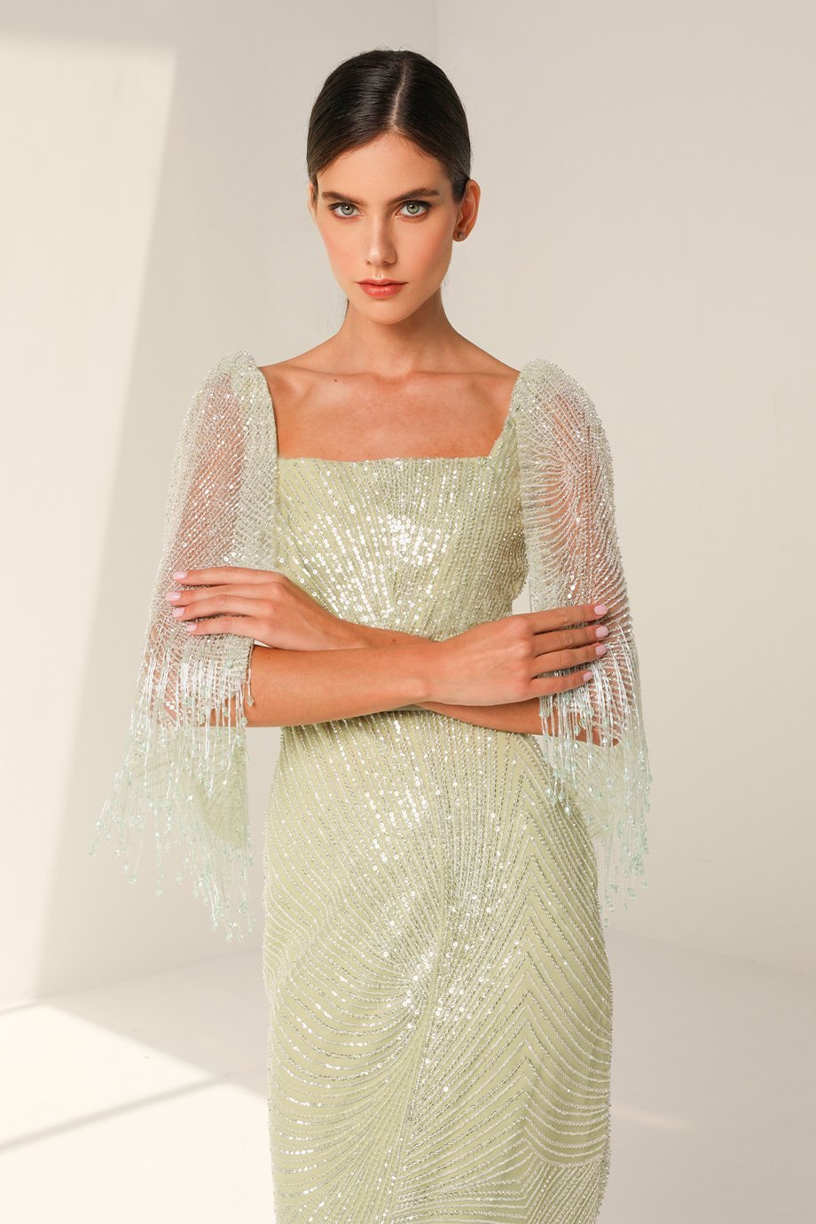 The highlight of this dress is undoubtedly its exquisite hand-crafted crystal tassels. Draped delicately over the cape sleeves, these tassels add an ethereal charm, enhancing your natural elegance with every movement. Crafted by skilled artisans, the attention to detail ensures a one-of-a-kind addition to your wardrobe.