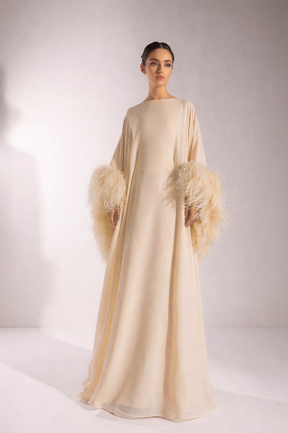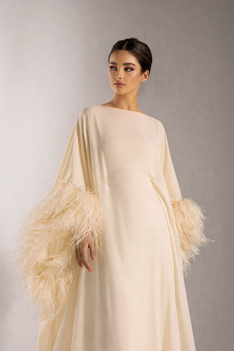 What sets this design apart is its subtle yet captivating focus on embellishments. The Scuba-lined A-cut dress is adorned solely with feather detailing, offering a luxurious yet playful edge. The carefully placed feathers enhance the outfit’s texture and provide a unique finishing touch, one that is both stylish and sophisticated.