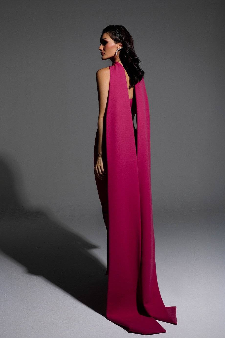 Maxi pencil cut dress is made from scuba crepe with stylish scarf.