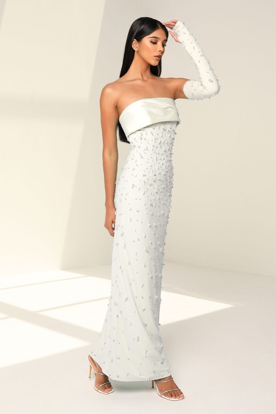 Crafted with premium crystals and pearls scuba fabric, this designer piece oozes luxury. The subtle shimmer and intricate embellishments set a high standard of elegance. Complementing this refined design are matching gloves, adorned with the same exquisite crystals and pearls, ensuring a cohesive, polished look. Perfect for lovers of sophistication and elevated design details.