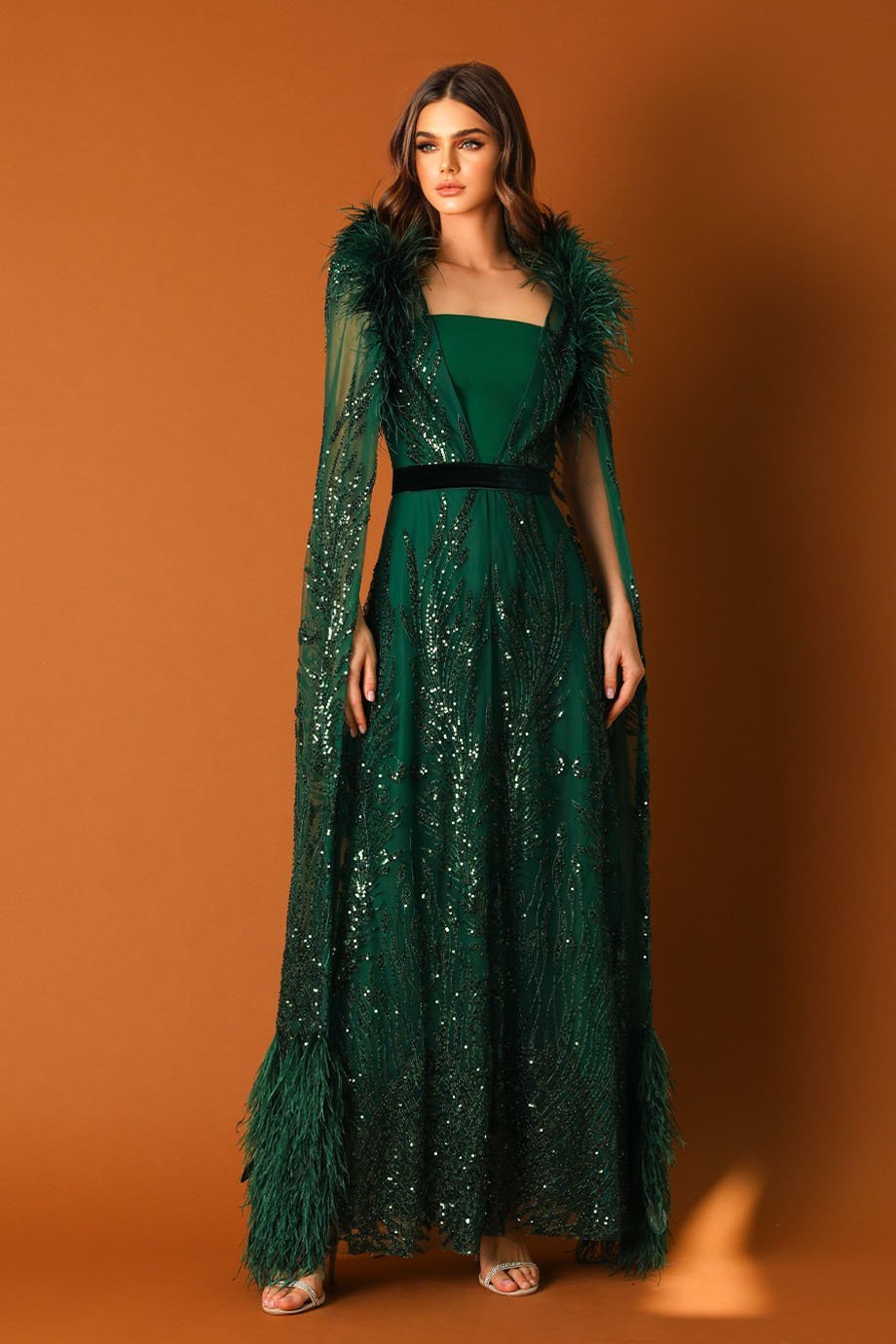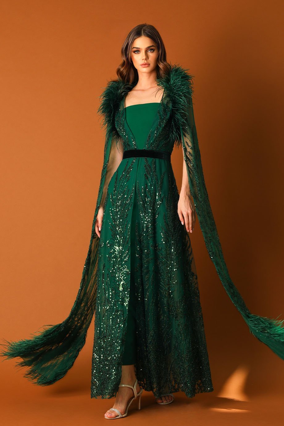 The outer kaftan layer takes your style to new heights with its evening-length design and luxurious fabric. The V-neckline enhances your neckline, adding a touch of grace. Embellished with exquisite stone sequins and beads on feather-textured fabric, this kaftan exudes charm and sophistication, perfect for glamorous evenings or special celebrations.