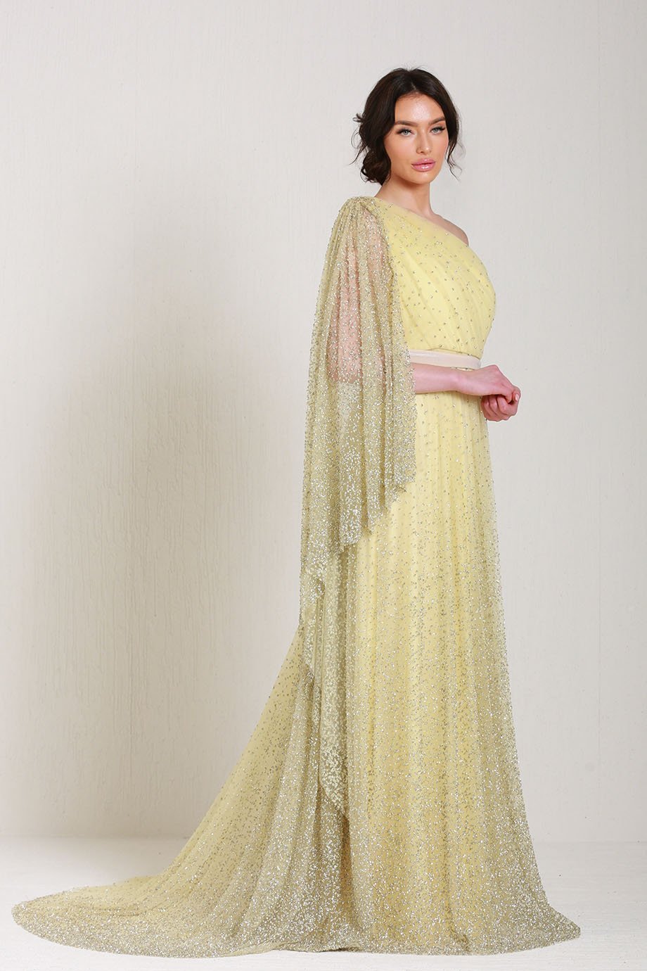 Step into timeless sophistication with this exquisite one-shoulder floor-length gown. Designed to make a statement, its gathered neck detail effortlessly frames your silhouette, creating a look that’s as graceful as it is striking. Perfect for formal occasions, galas, or any event where you want to leave a lasting impression.