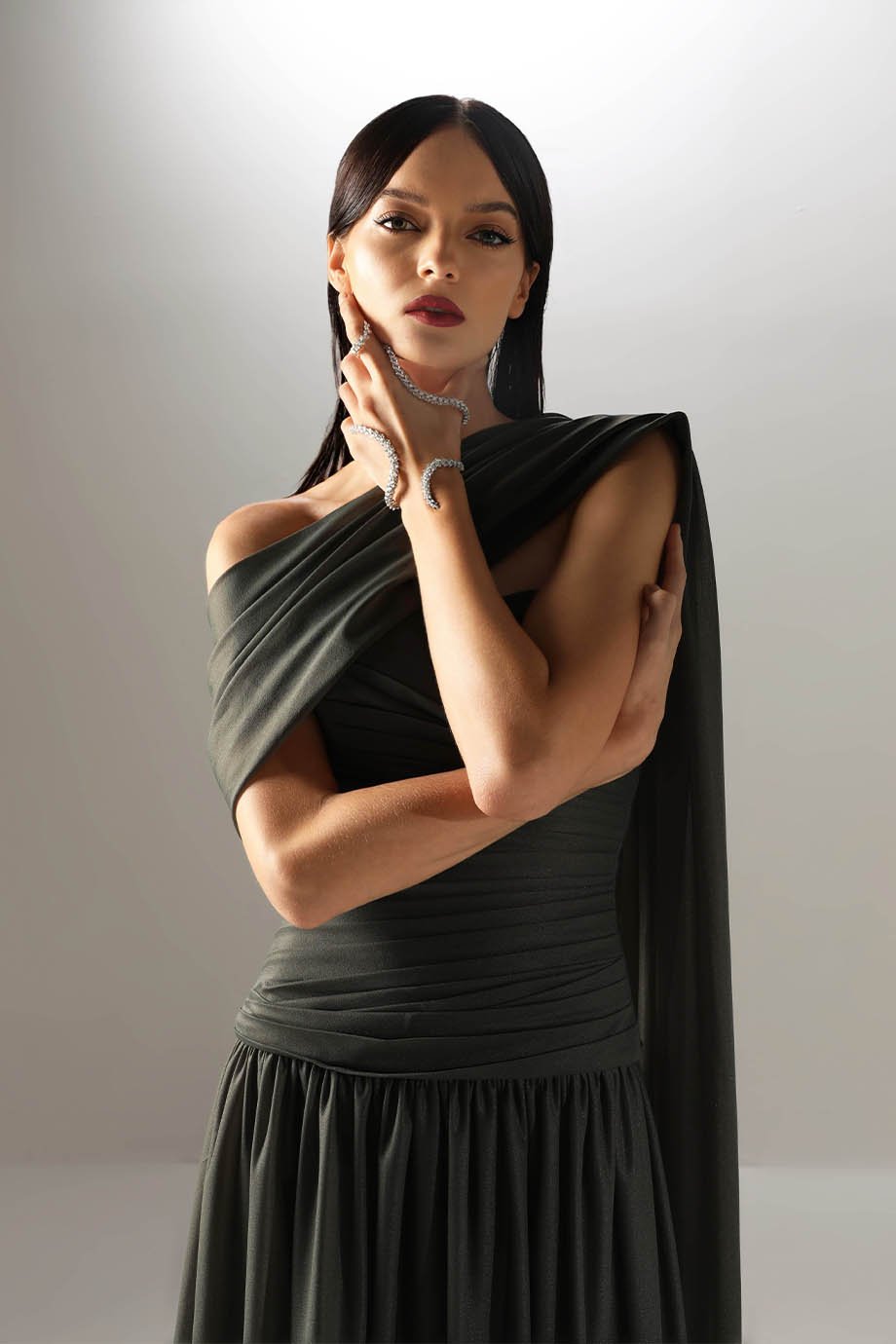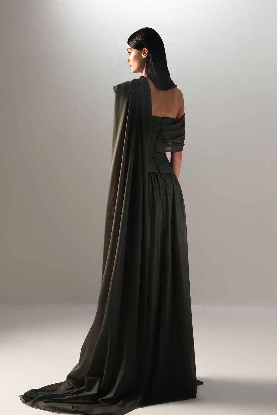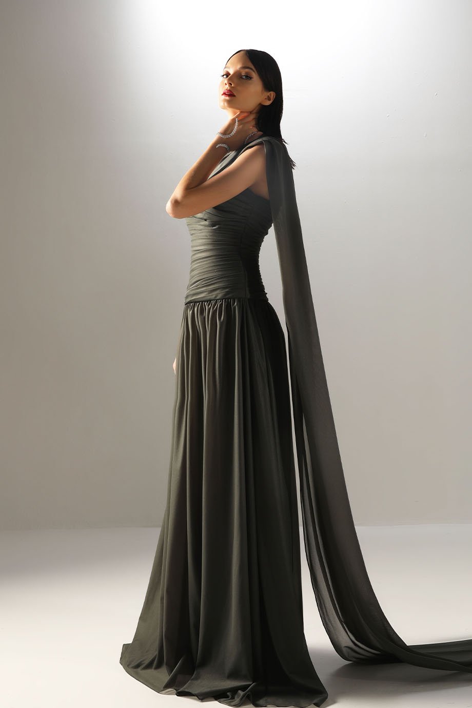 - Draped drop waist unique chiffon, evening length dress, attached shawl