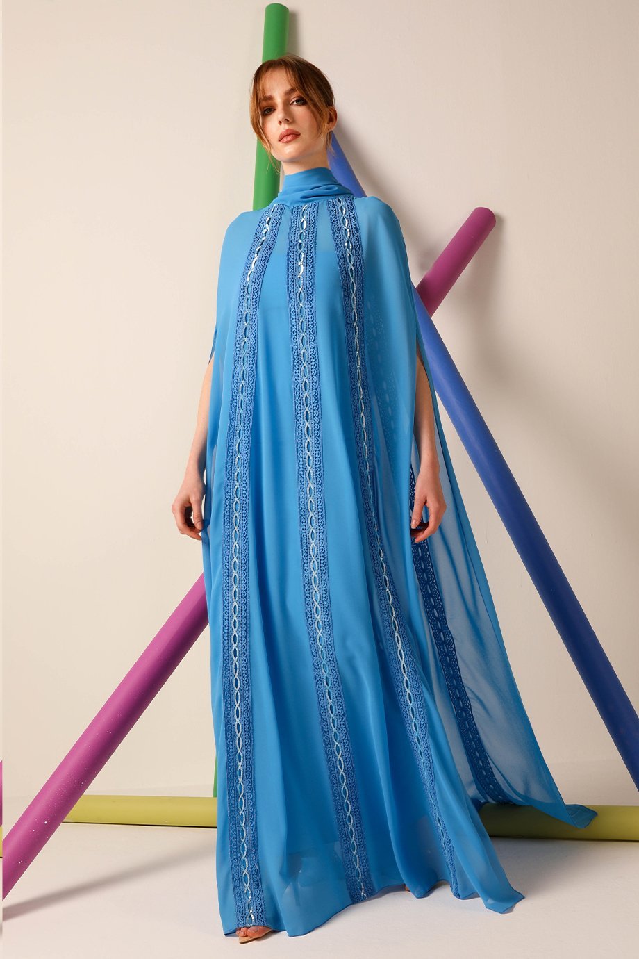 The embroidered lace cape is a testament to fine craftsmanship, offering intricate details that instantly elevate your look. Its soft, flowing fabric exudes elegance, while the shawl detail at the neck provides a polished finish. Whether it’s a formal gathering or an elegant evening, this outfit guarantees you’ll be the center of attention.