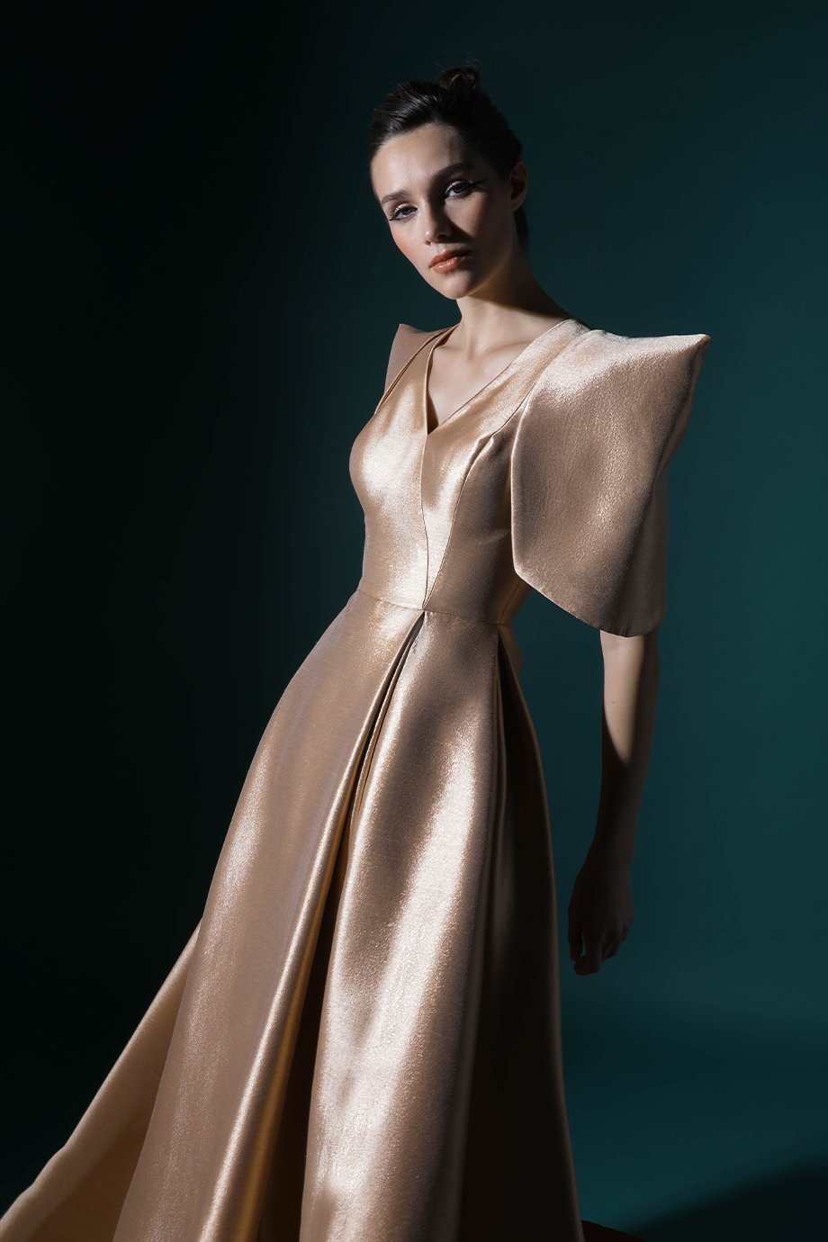 A stunning ballgown crafted from luxurious mikkado fabric, featuring dramatic statement shoulders that create a bold, unforgettable silhouette.