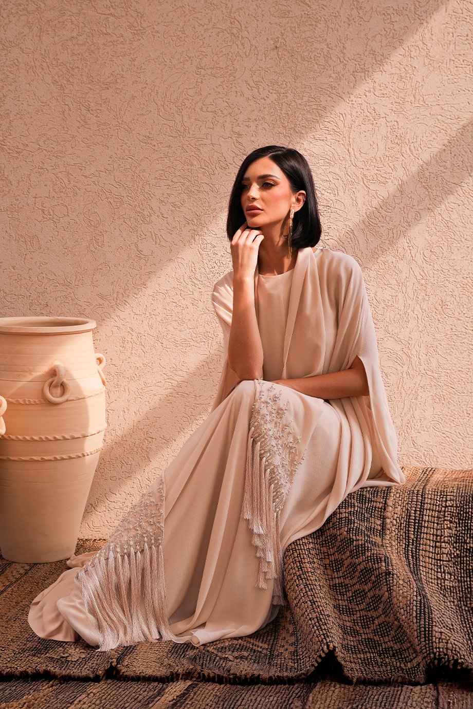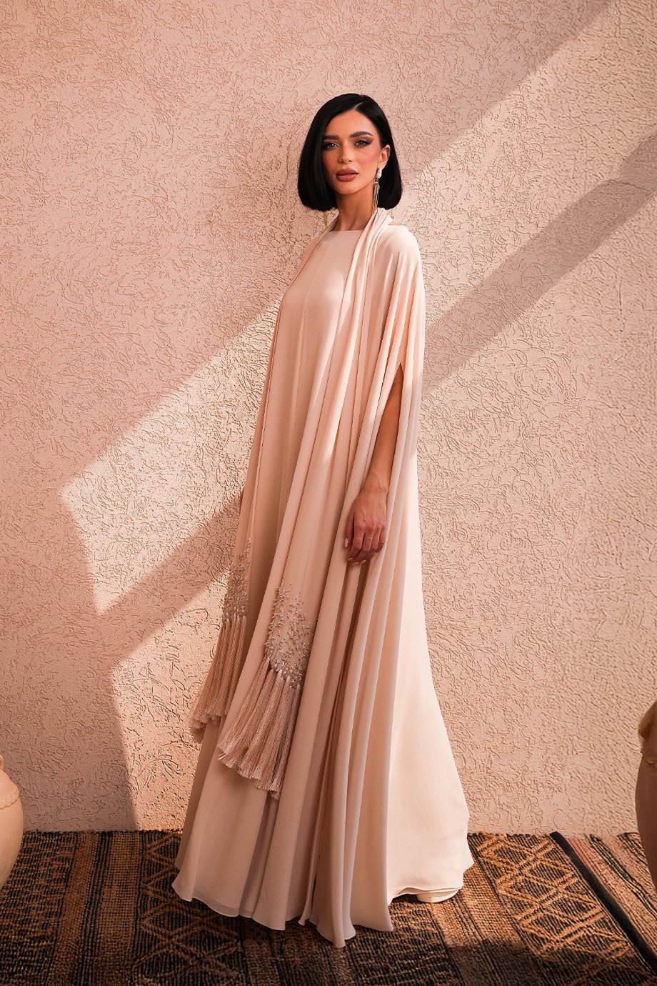 Featuring an inner A-cut scuba base paired with a chiffon kaftan and shawl, accented with hand-beaded crystal embroidery and tassel details.