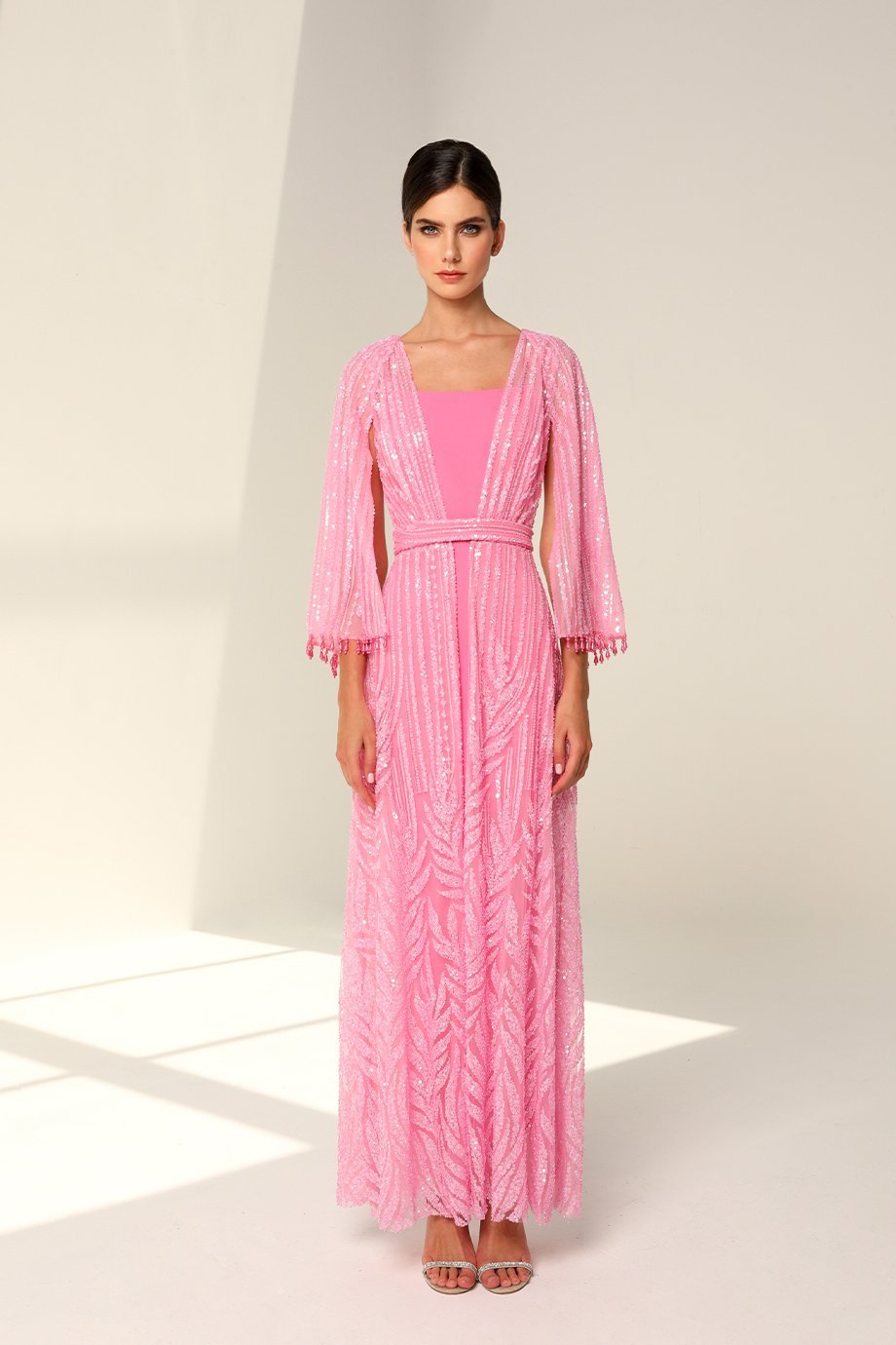 Every detail of this dress kaftan set exudes refinement. The embellished cape sleeves, adorned with sparkling stones, sequins, and beadwork, add a dazzling touch of glamour. The shimmering accents make this outfit perfect for events that call for a memorable yet sophisticated style.
