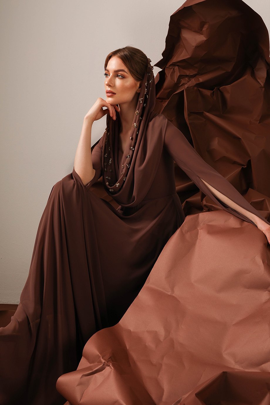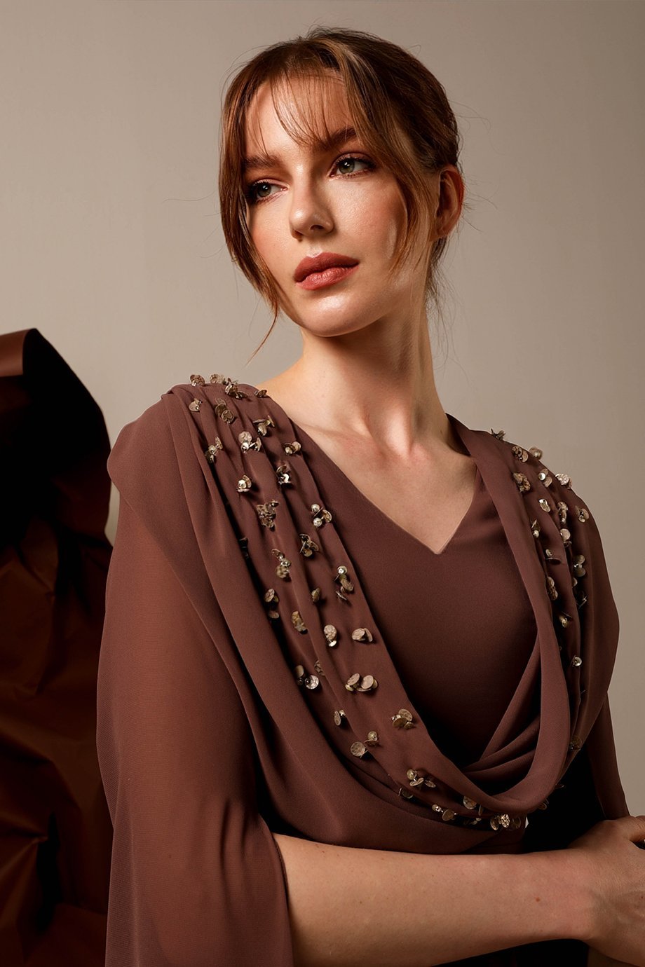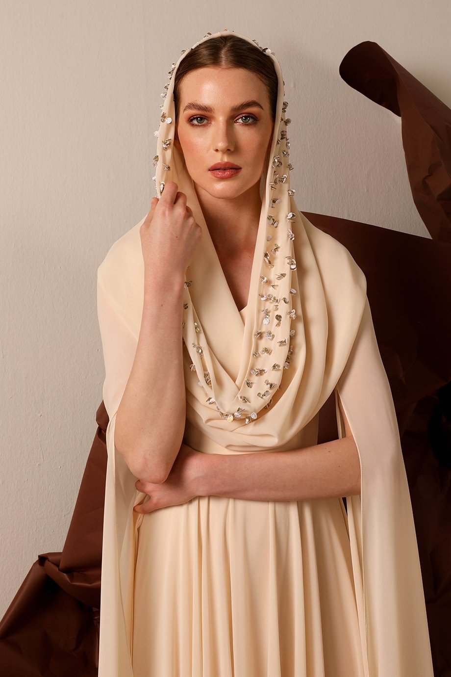 Discover a stunning chiffon dress that redefines sophistication. Designed with long, flowing sleeves and a flattering silhouette, it offers a graceful fit for any occasion. The added charm of a hand-embellished hoodie elevates its style, making it a unique statement piece in your wardrobe.