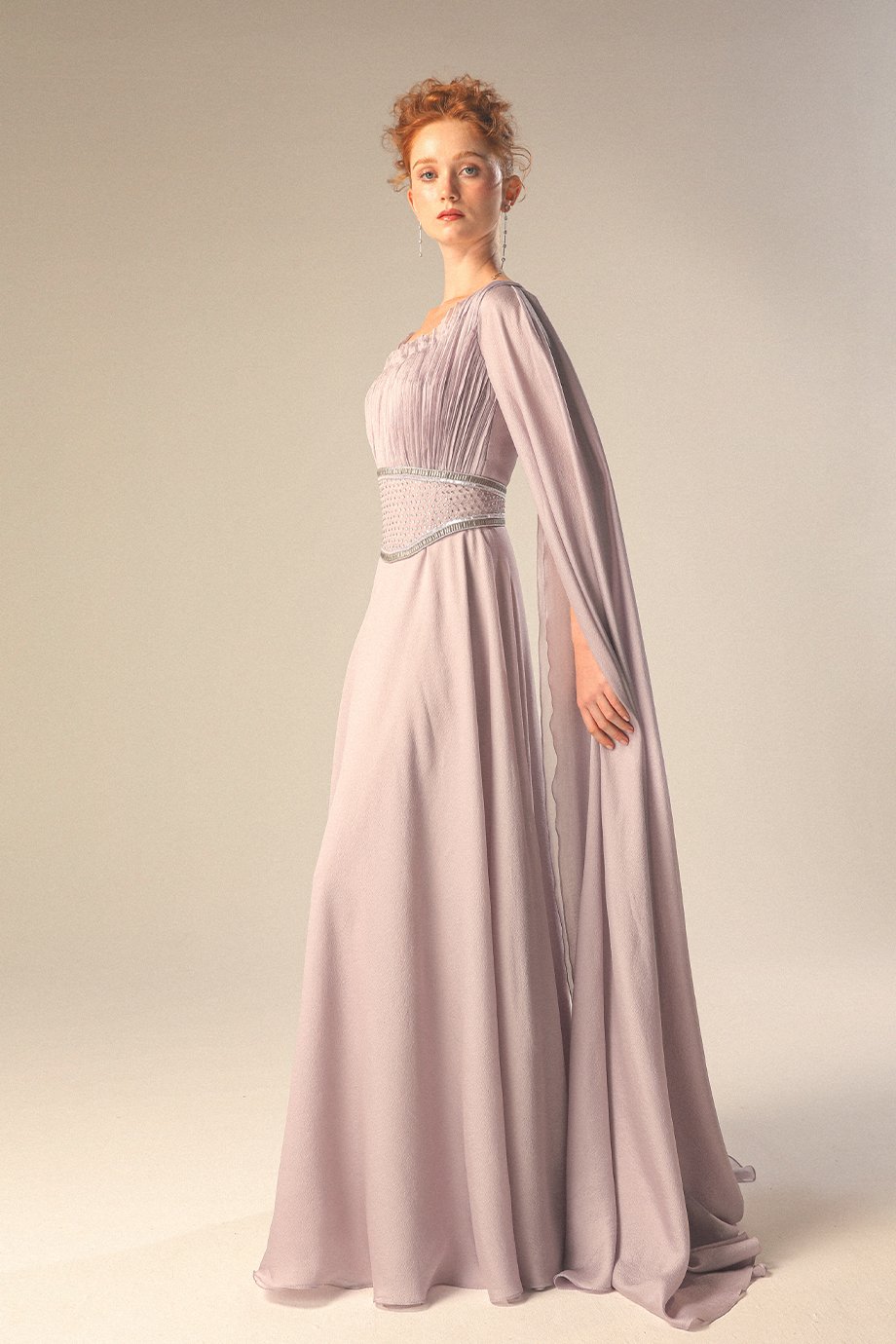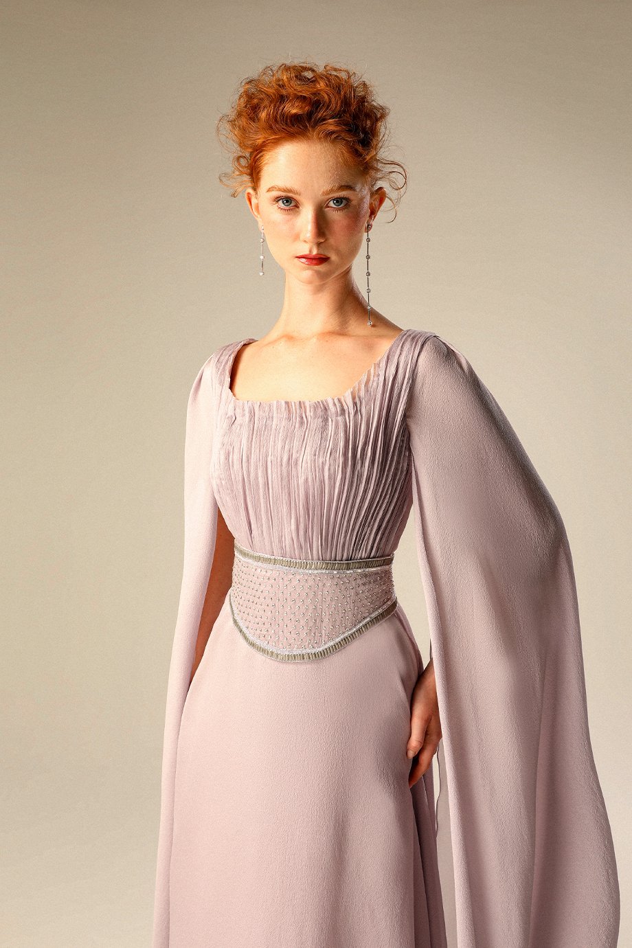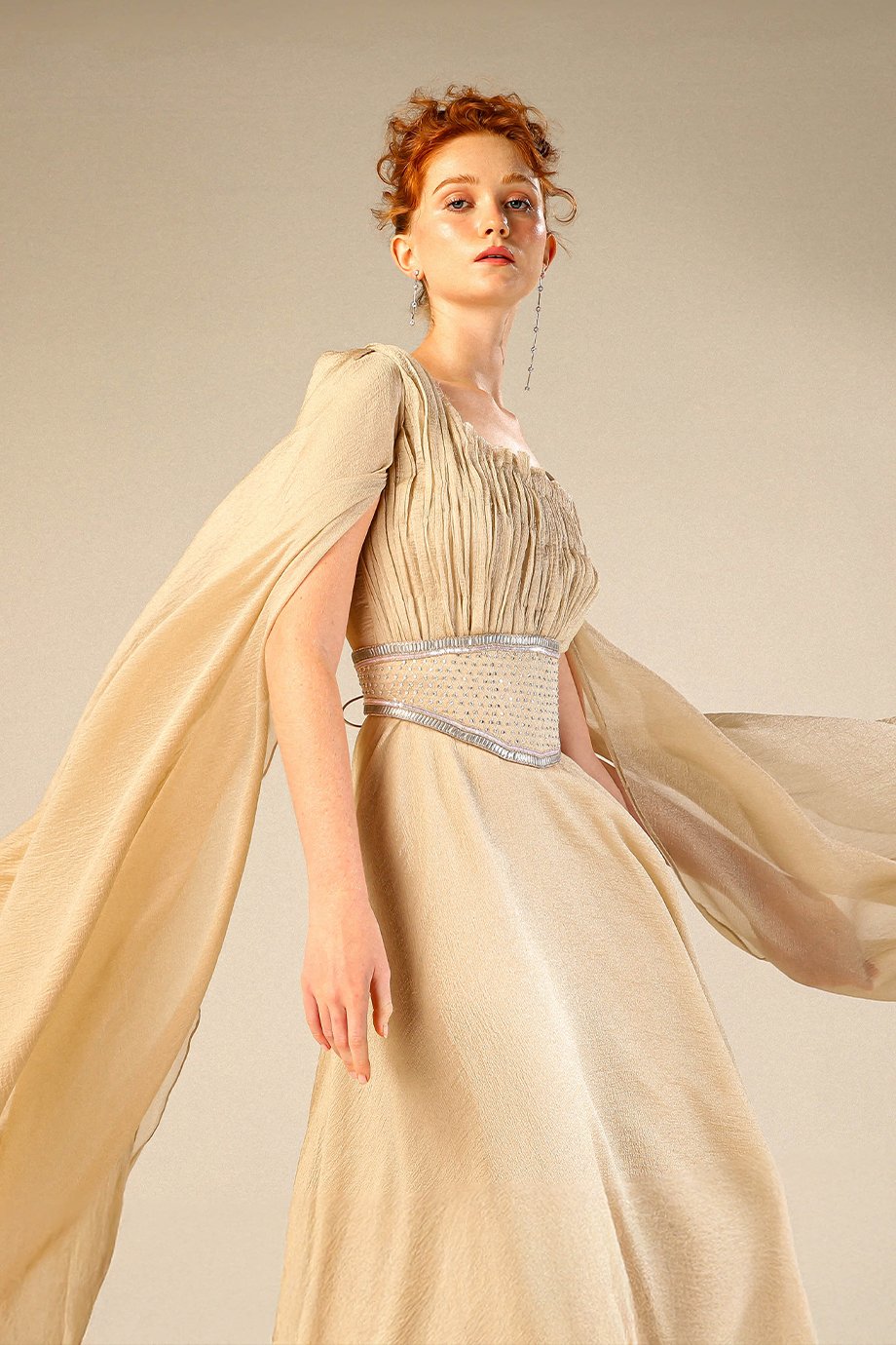 Every detail of this dress has been carefully designed to exude luxury. The delicate ruching detail adds depth and texture, enhancing the timeless aesthetic of the piece. Paired with an intricately embroidered belt, this element accentuates the waistline to create a polished, refined look that’s perfect for formal events or special occasions.