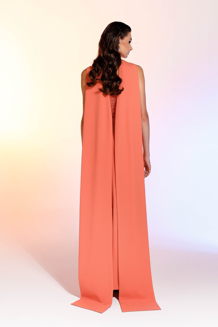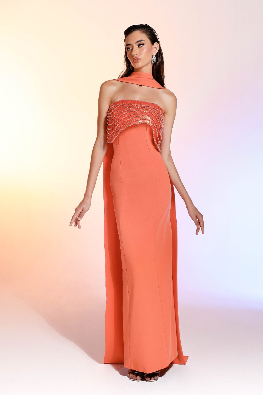 Floor-length sheath dress is made from scuba crepe and features layered handmade embellishments with stylish scarf.