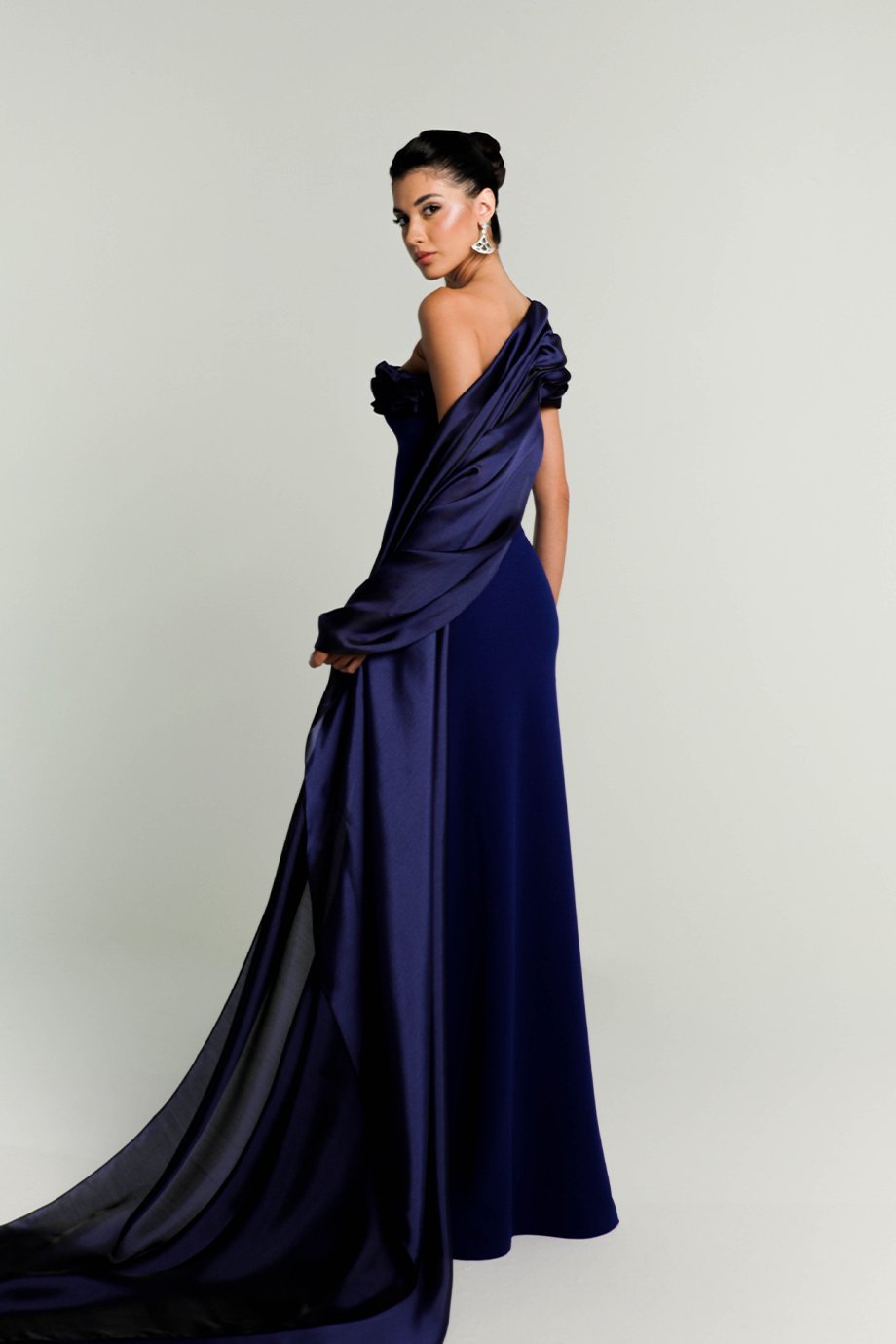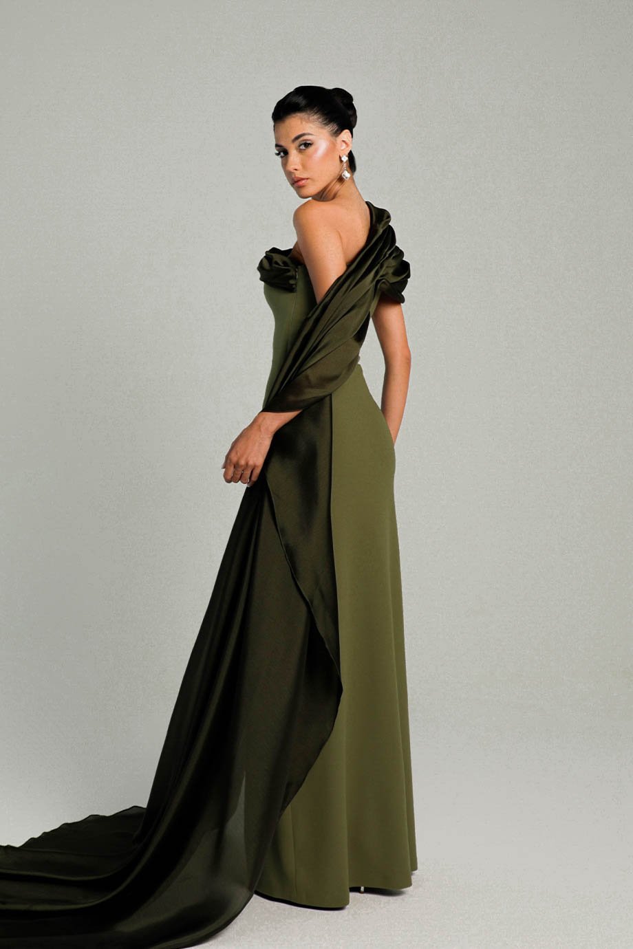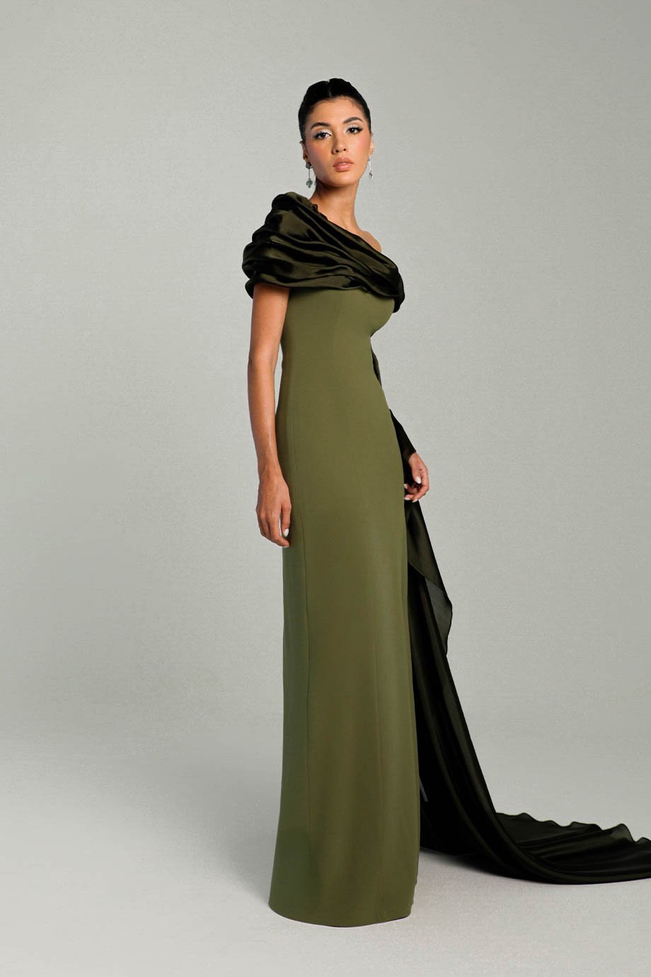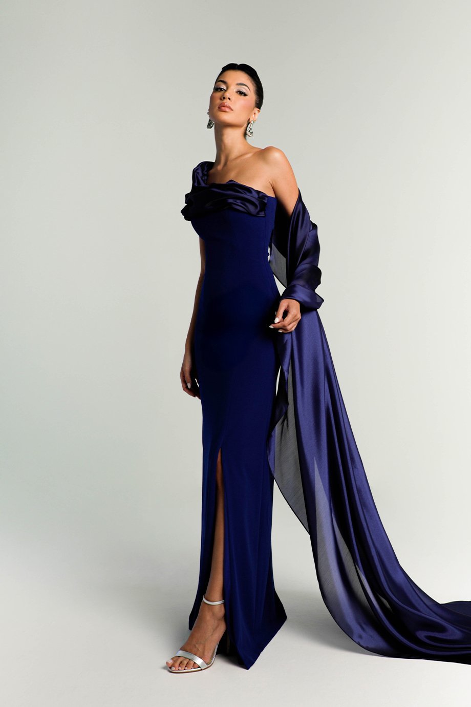 The gown features a chic side slit, adding allure and sophistication to your look. What truly sets this piece apart is the asymmetric hand-manipulated organza shoulder shawl. This artistic detail brings a touch of bespoke luxury, making it an extraordinary garment for formal events, galas, or upscale gatherings.