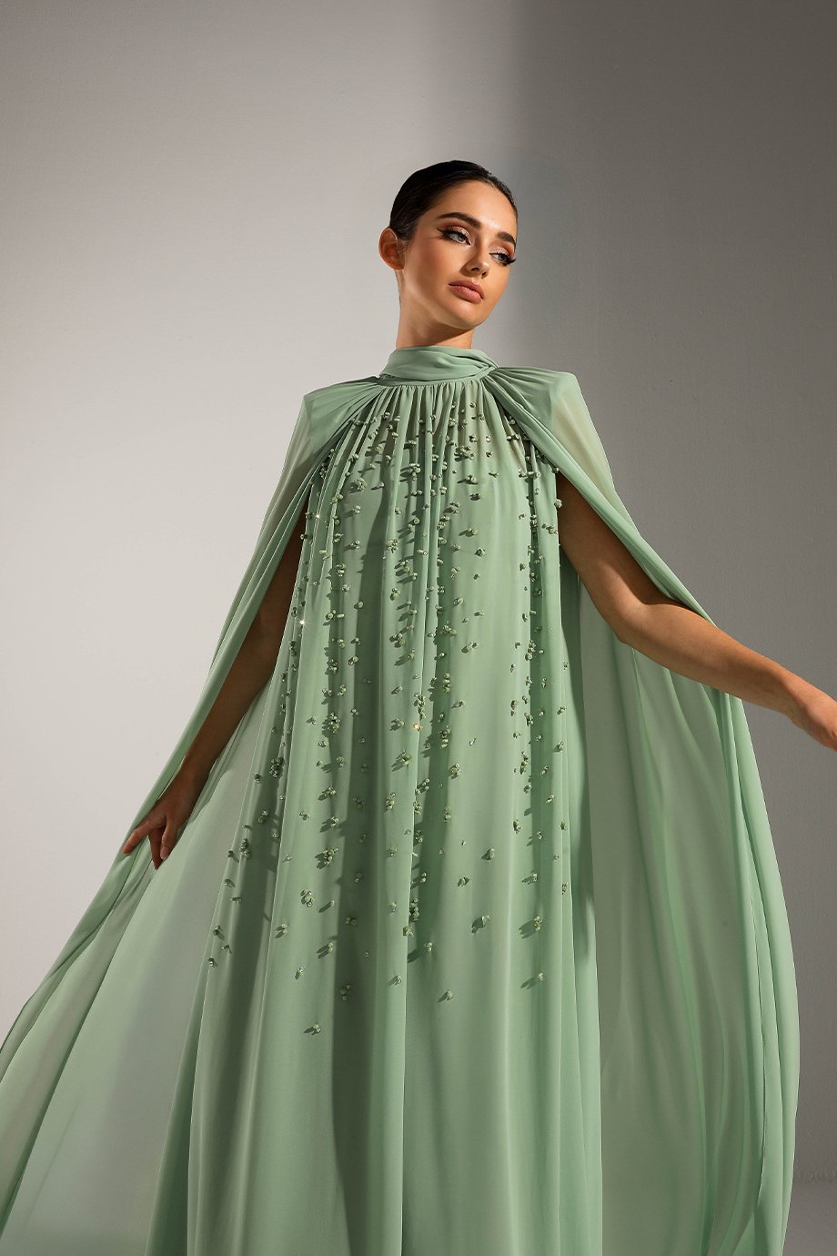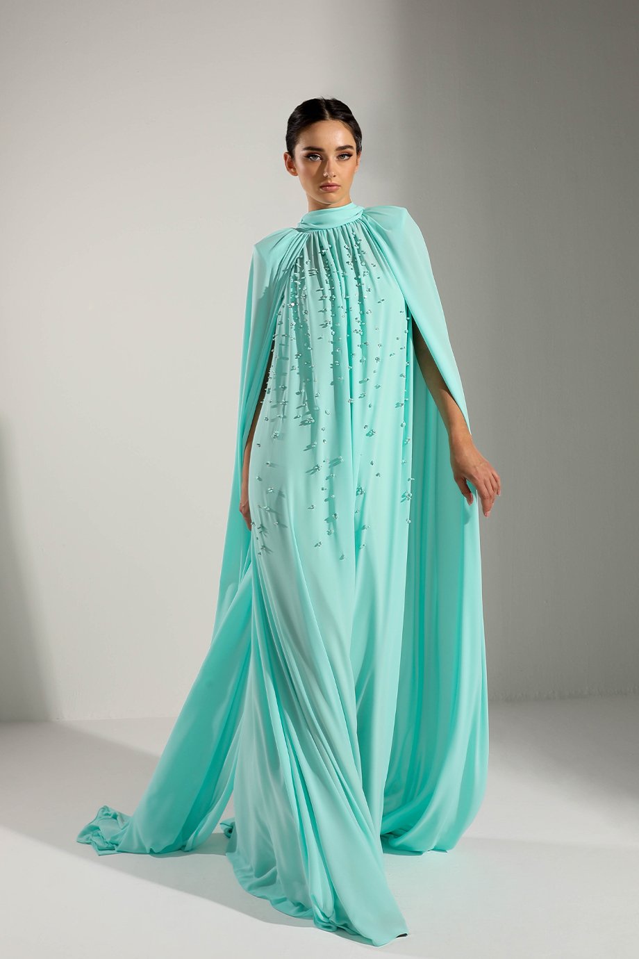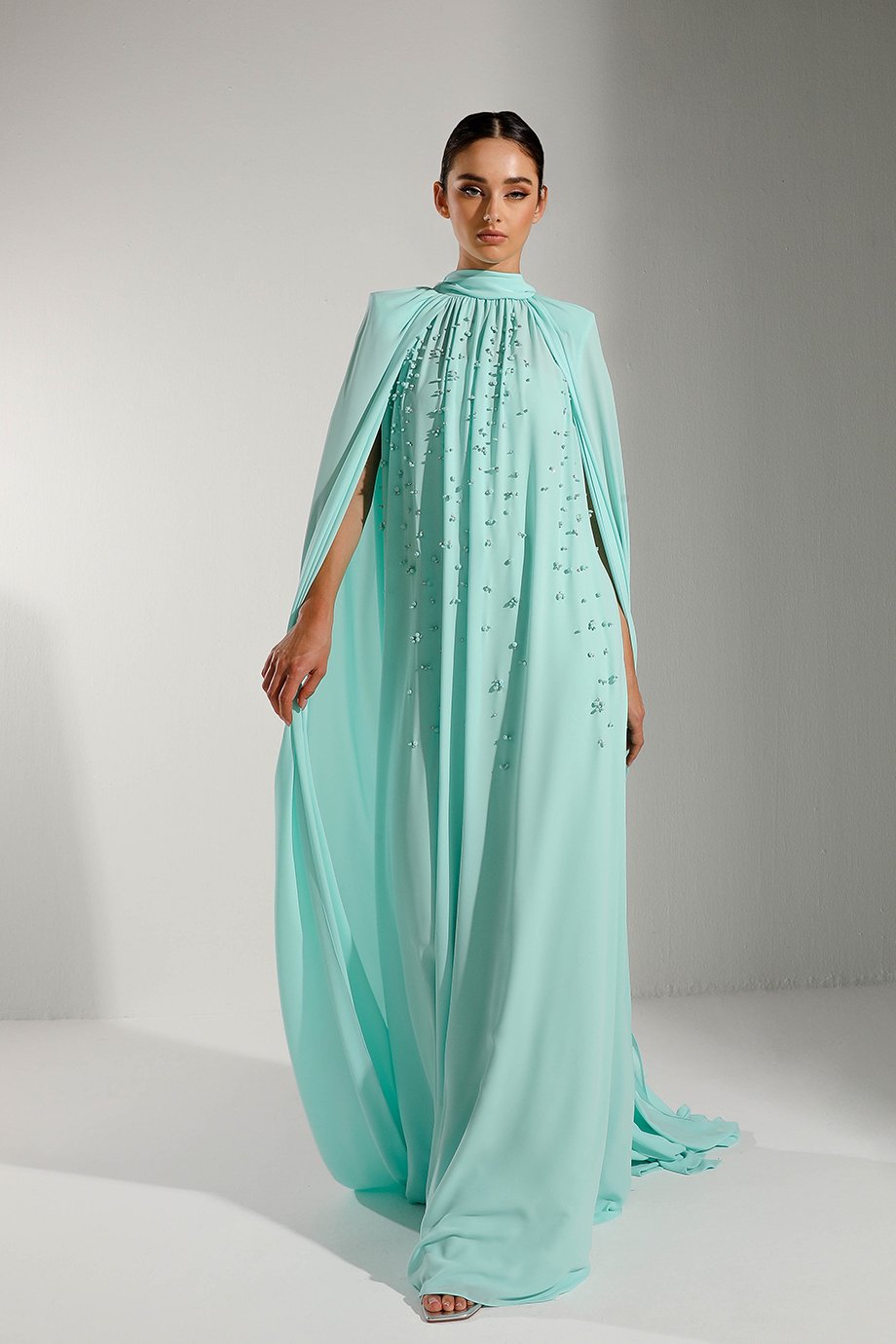 An A-cut scuba dress layered with a chiffon kaftan, adorned with intricate hand embroidery featuring sequins, beads, and crystals.