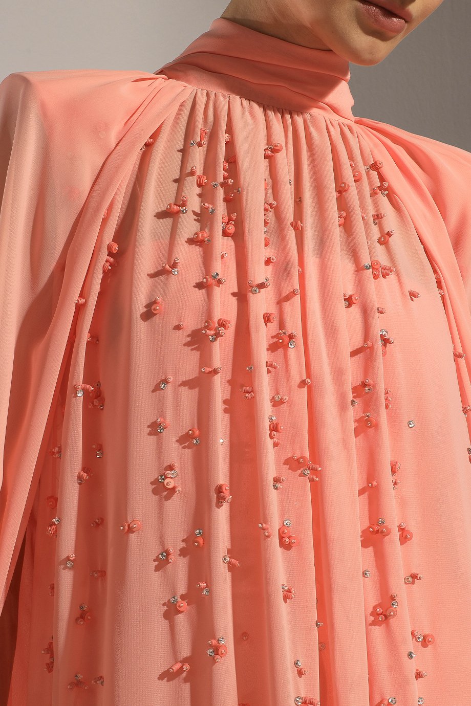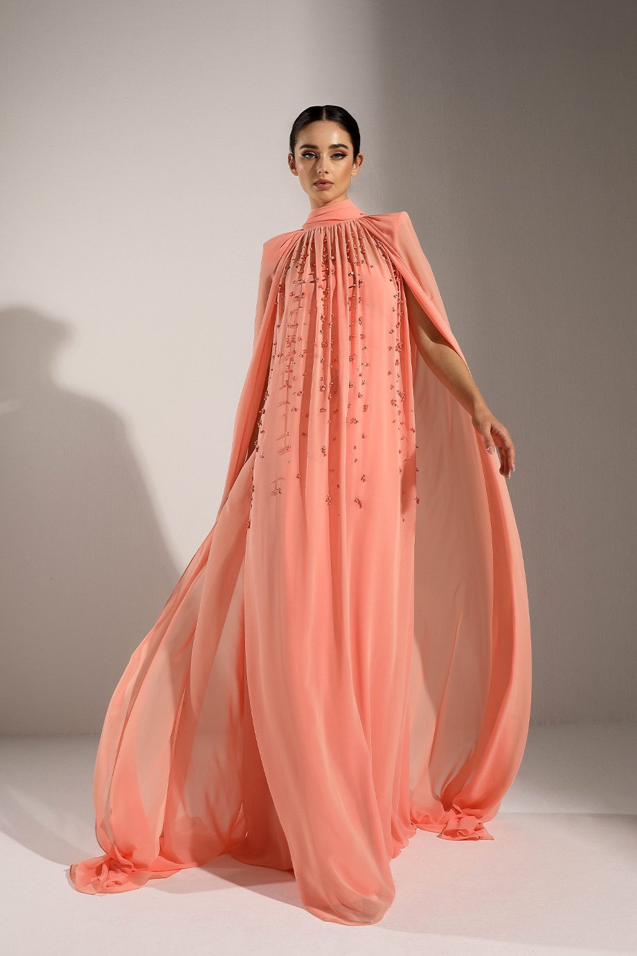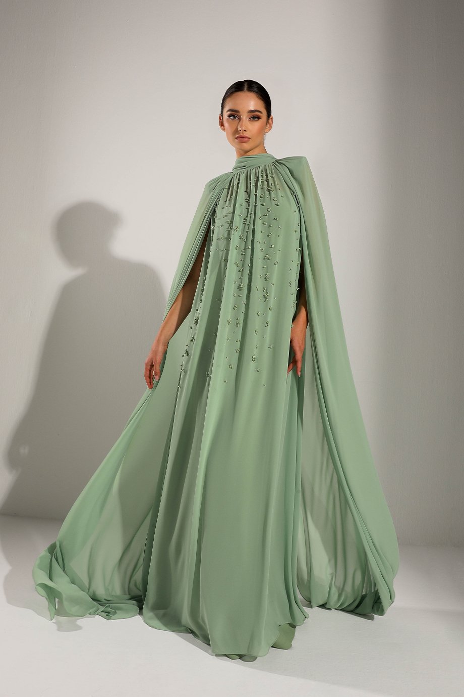 An A-cut scuba dress layered with a chiffon kaftan, adorned with intricate hand embroidery featuring sequins, beads, and crystals.