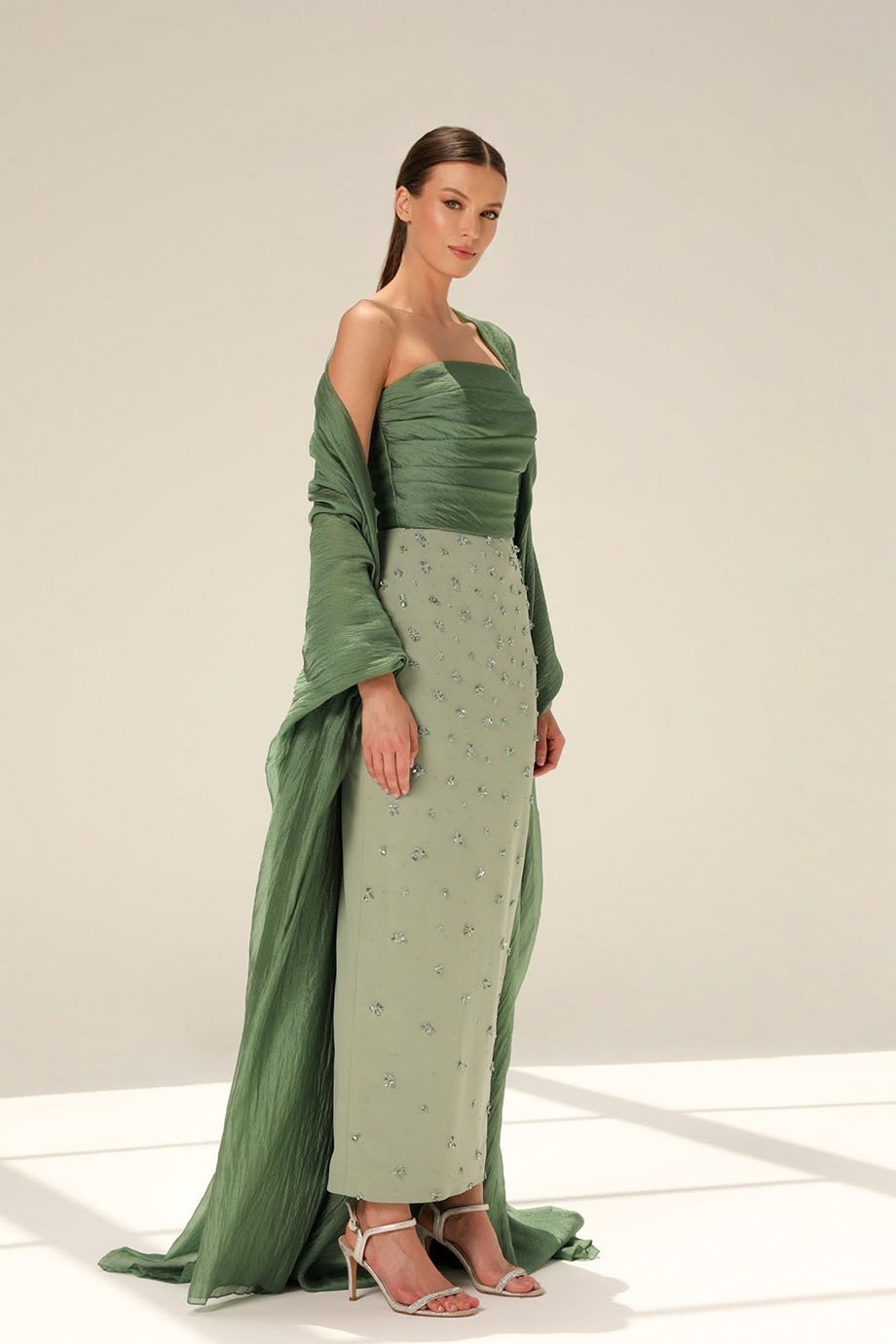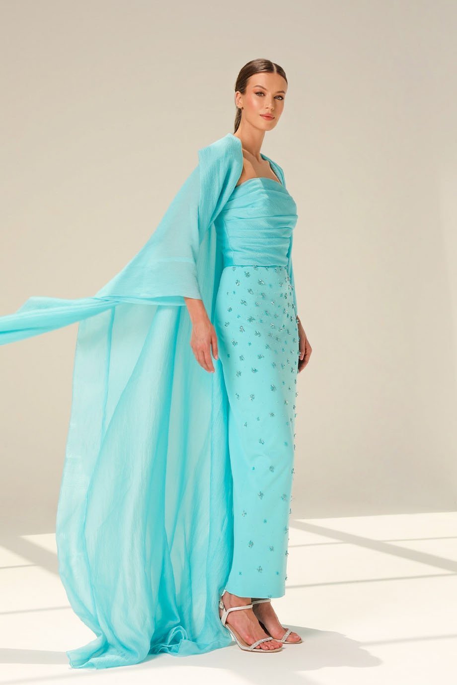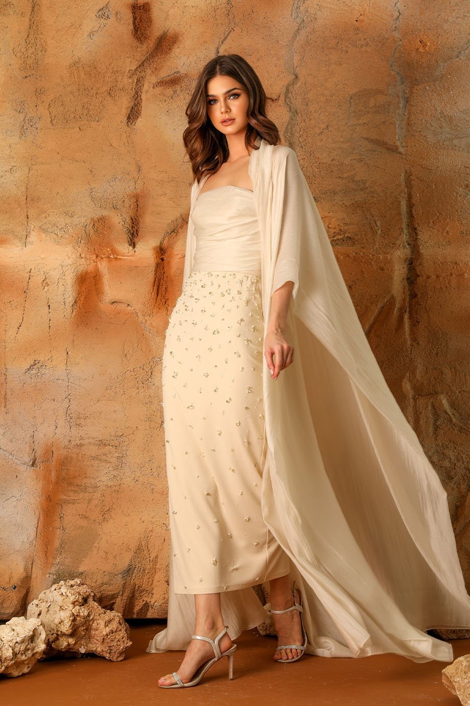Add an effortlessly elegant touch to your wardrobe with this stunning 2-piece dress kaftan set. Featuring a meticulously crafted inner dress adorned with crystals, delicate sequins, and artistic beadwork, this outfit seamlessly combines modern flair and traditional design elements. The pencil-cut silhouette and midi length offer a perfectly tailored fit that flatters your figure, while the gathered tissue organza neck detail adds a sophisticated focal point to your ensemble.