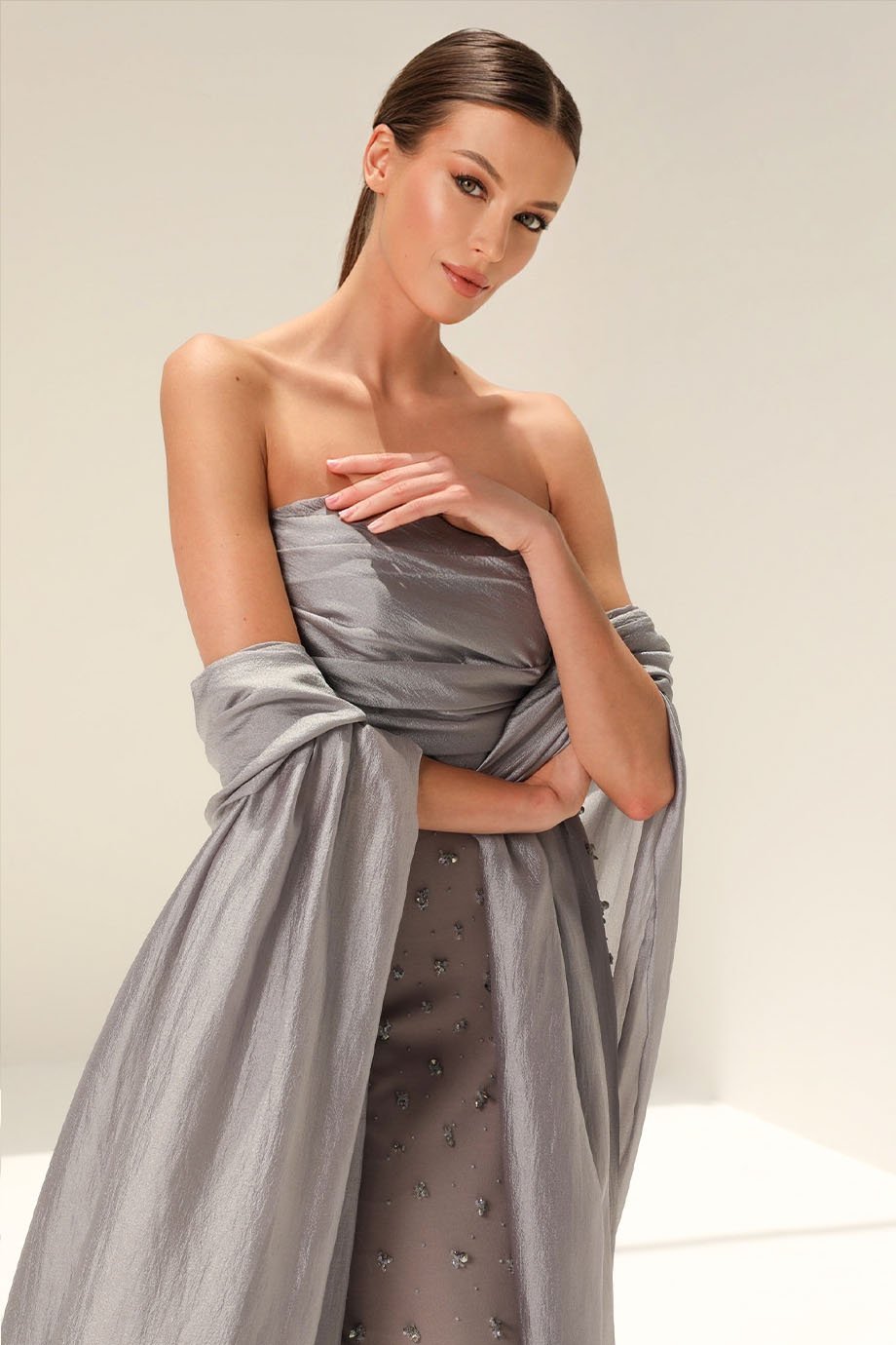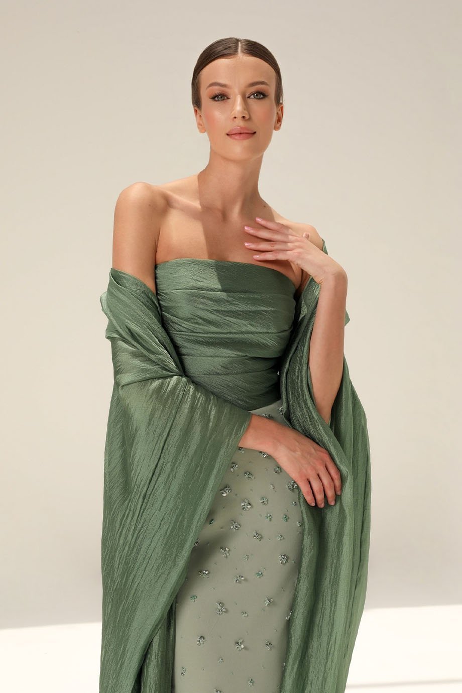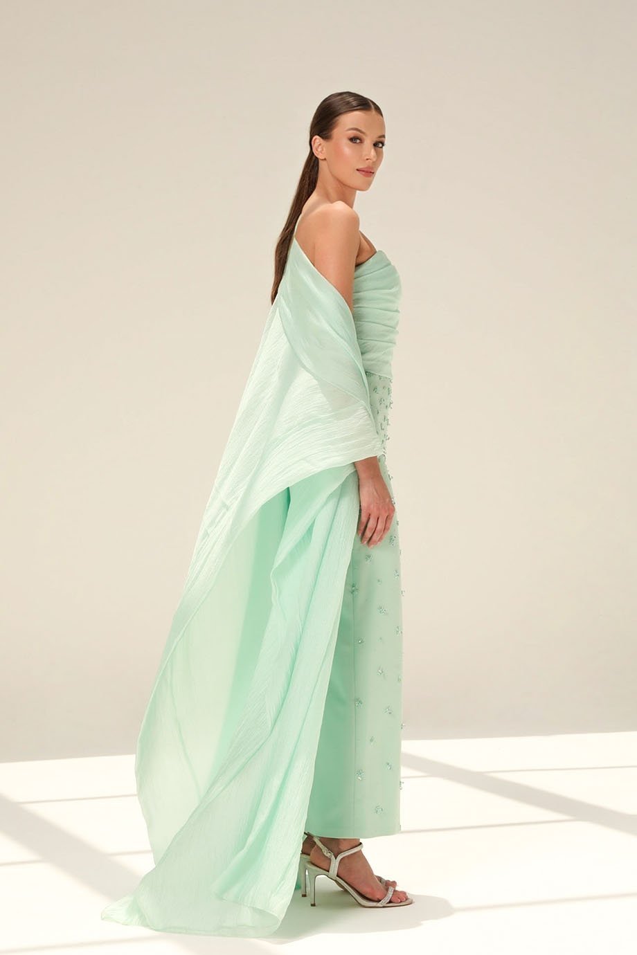 Add an effortlessly elegant touch to your wardrobe with this stunning 2-piece dress kaftan set. Featuring a meticulously crafted inner dress adorned with crystals, delicate sequins, and artistic beadwork, this outfit seamlessly combines modern flair and traditional design elements. The pencil-cut silhouette and midi length offer a perfectly tailored fit that flatters your figure, while the gathered tissue organza neck detail adds a sophisticated focal point to your ensemble.
