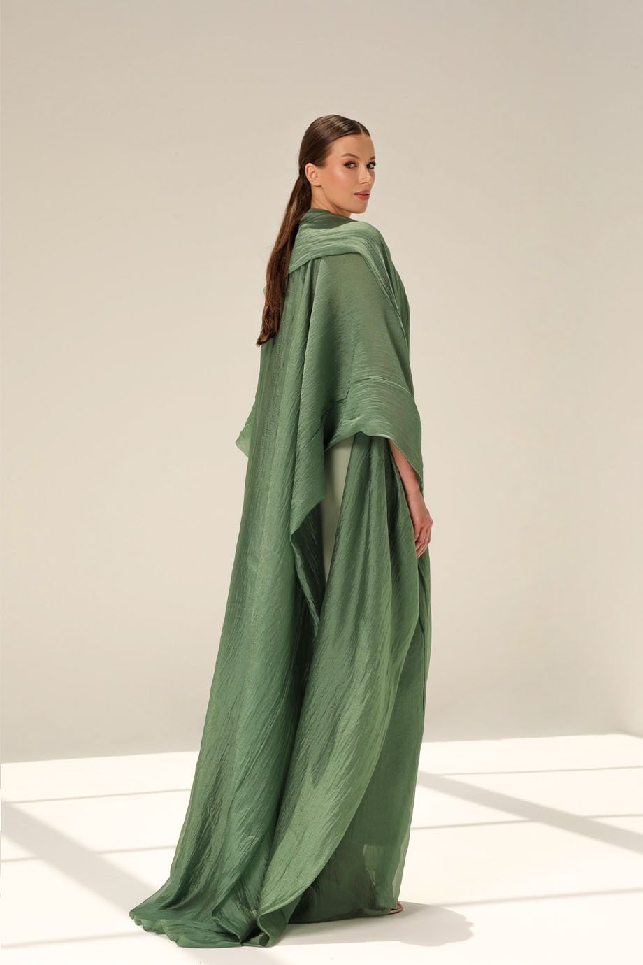 The outer dress is designed to turn heads with its floor-length kaftan cut, made from premium-quality tissue organza fabric. Its butterfly sleeves create a sense of fluid movement, adding dimension and a hint of drama to any occasion. This versatile outer layer drapes beautifully over the inner dress, creating a harmonious blend of style and comfort that’s perfect for any formal event, celebration, or festive gathering.