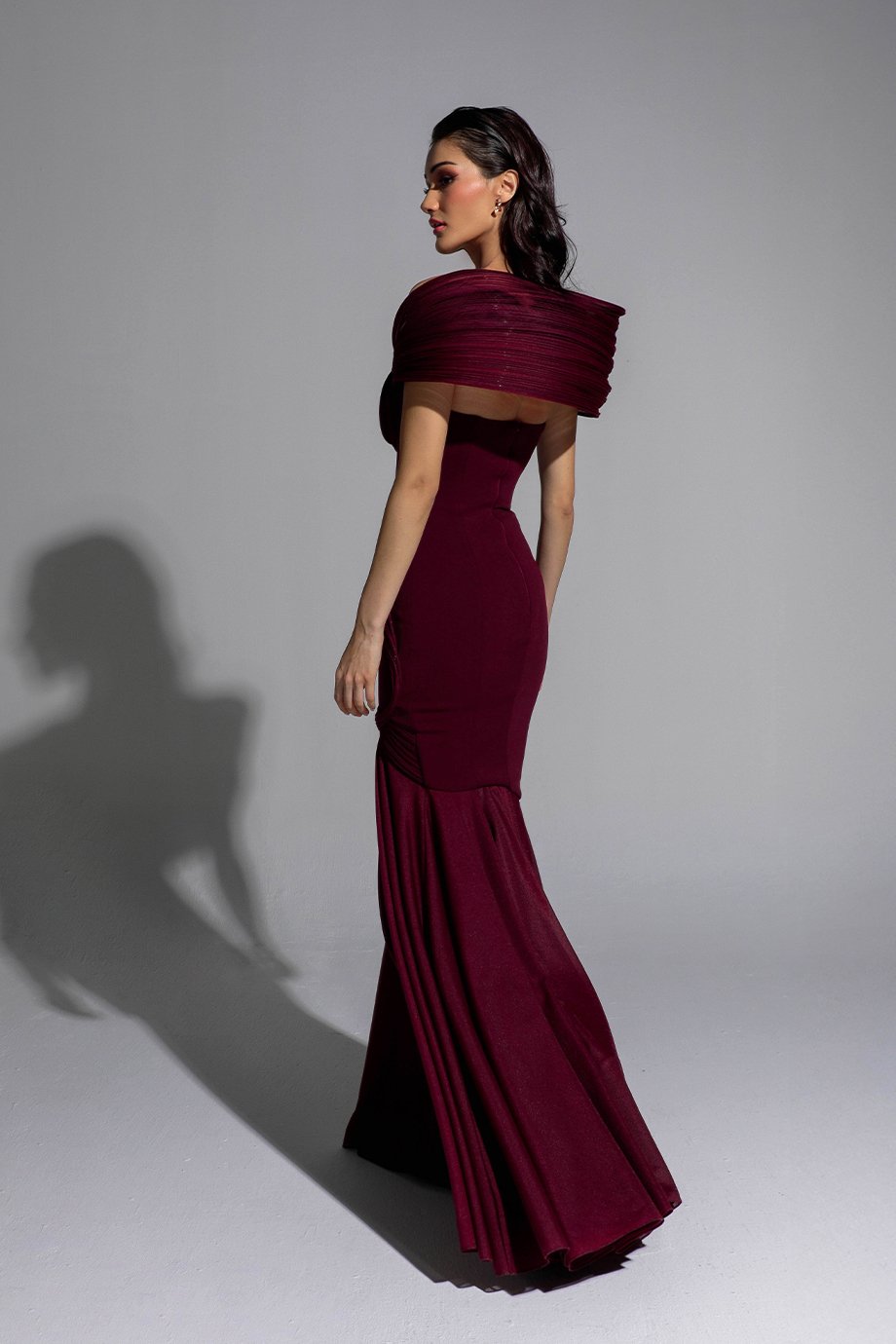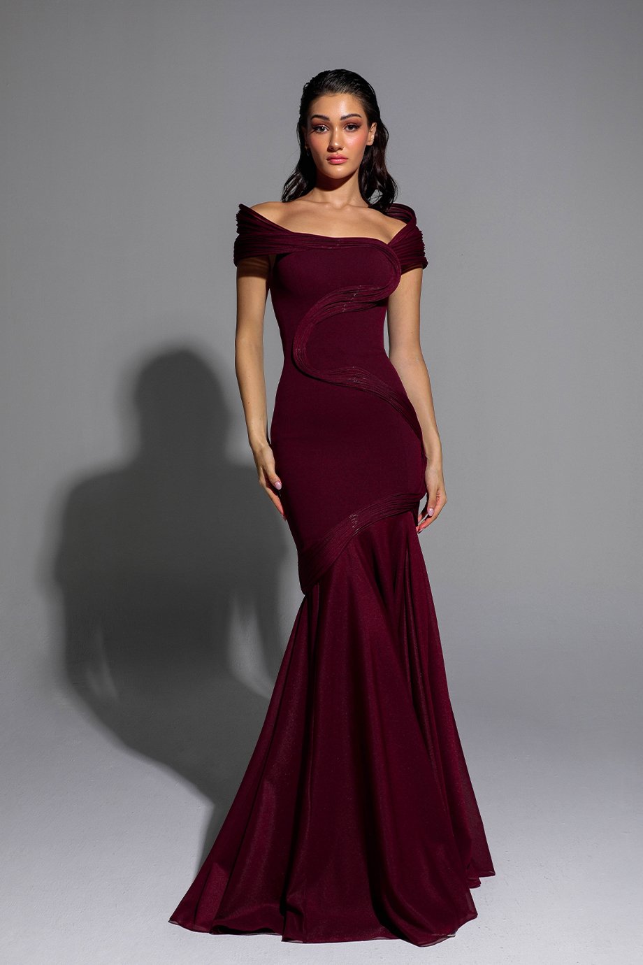 Floor-length mermaid silhouette dress features scuba fabric and textured chiffon with handmade chiffon fabric manipulation.