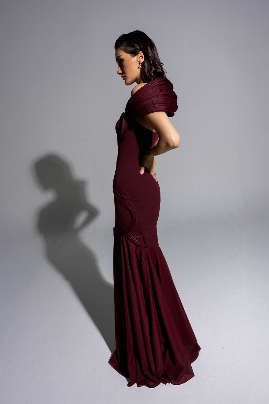 Crafted with meticulous attention to detail, this floor-length mermaid silhouette dress is a statement of elegance and grace. Enhanced by the finest scuba fabric and textured chiffon, it seamlessly combines modern design with timeless appeal. Whether for weddings, formal events, or evening galas, this dress is the epitome of sophistication.