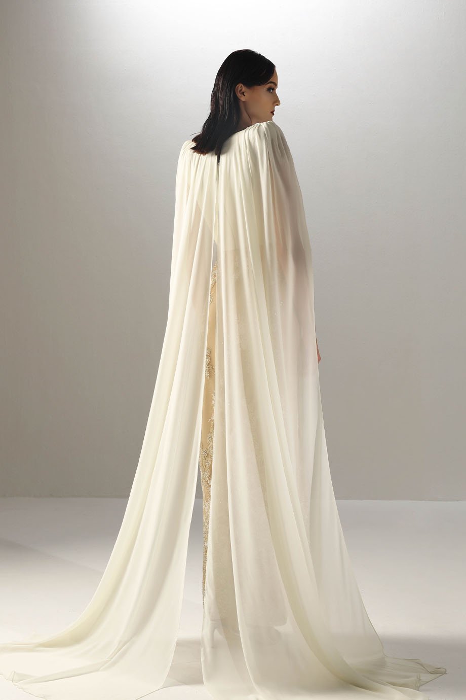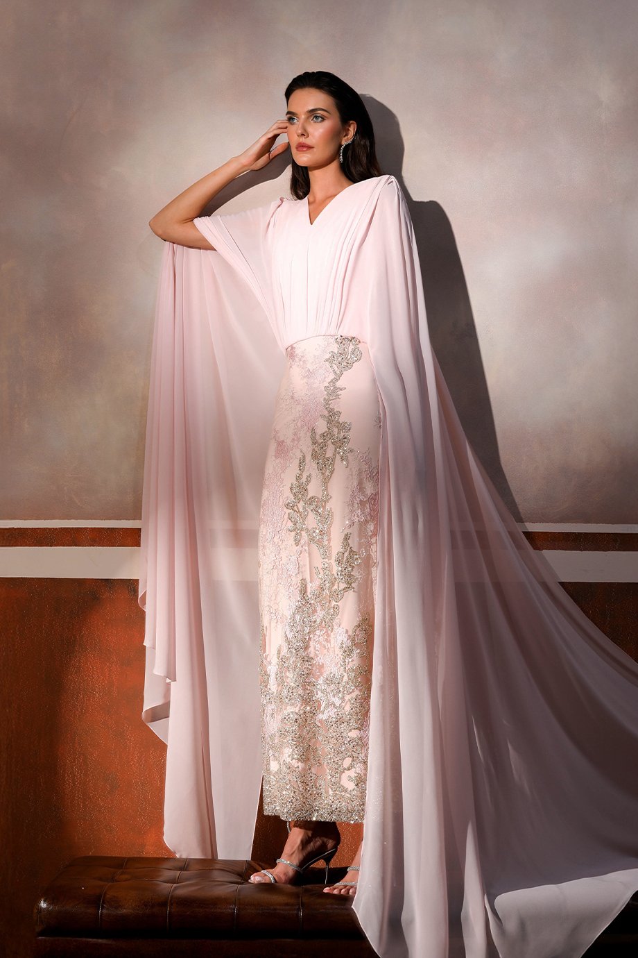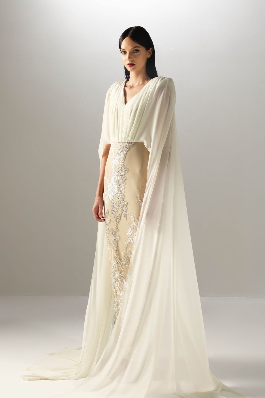 - Embroidered pencil lace skirt, evening length, long chiffon cape sleeves