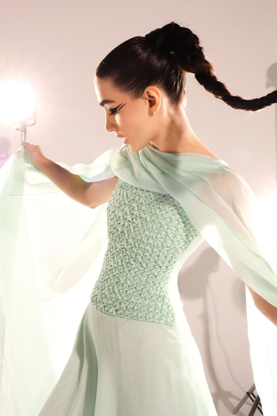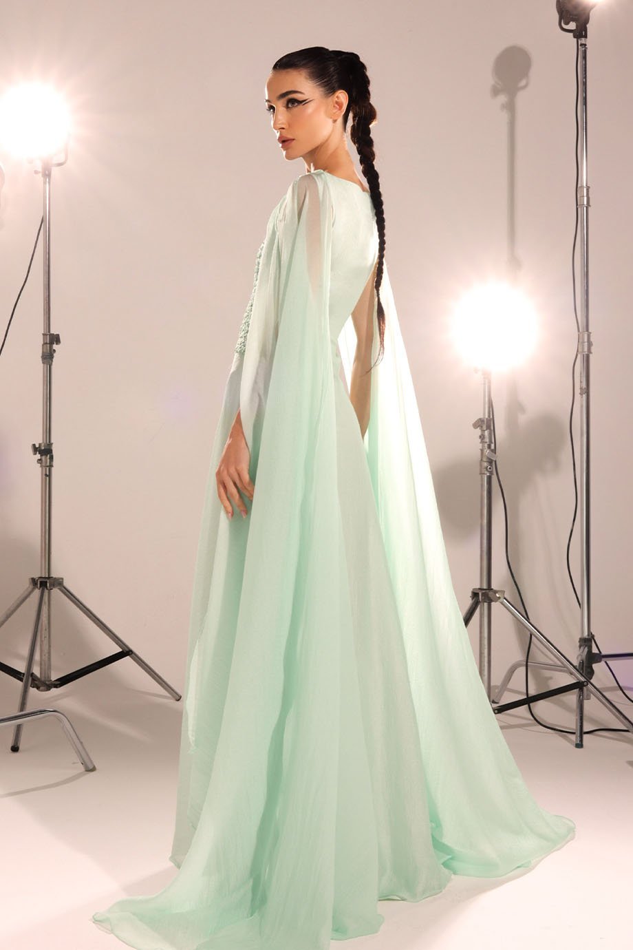Every element of this Shawl Cape Dress showcases unparalleled attention to detail. The cane weaving embroidery adds a touch of sophistication, reflecting the timeless artistry of handcrafted design. The delicate crystals catch the light effortlessly, giving you an impeccable, radiant glow. This combination of textures and embellishments makes the dress stand out as both versatile and one-of-a-kind.